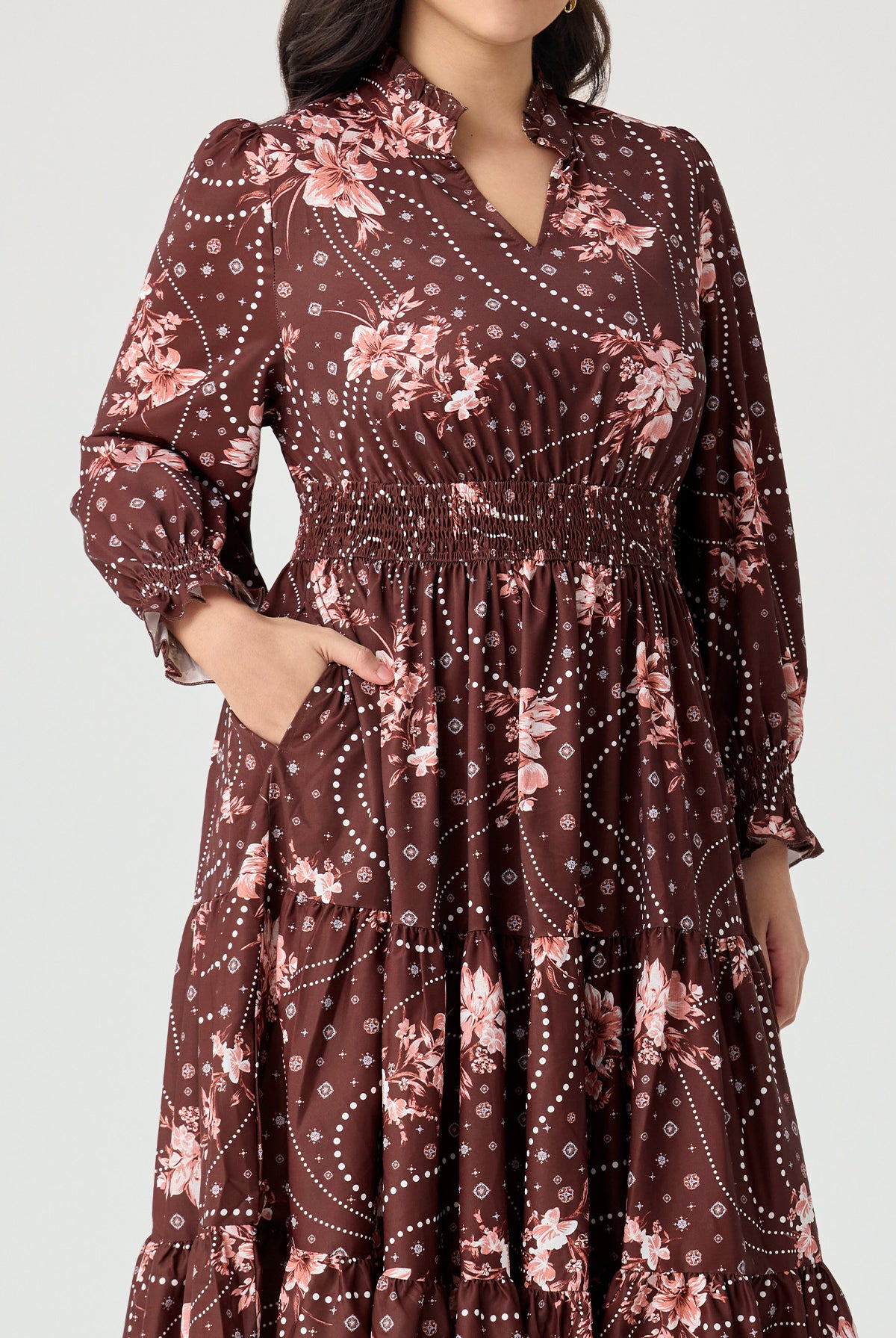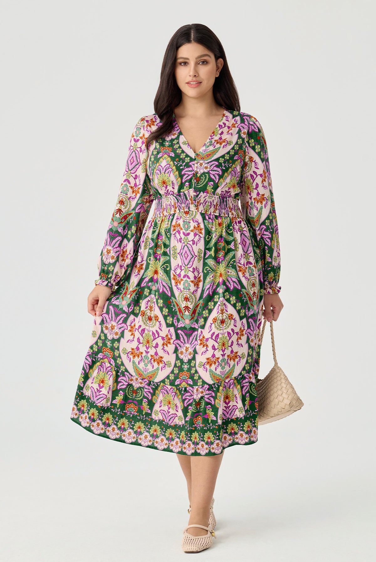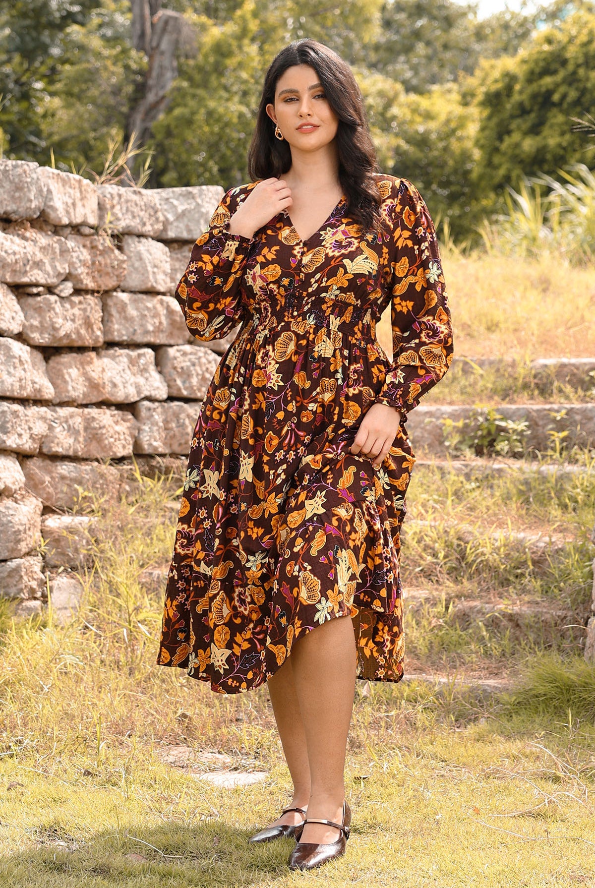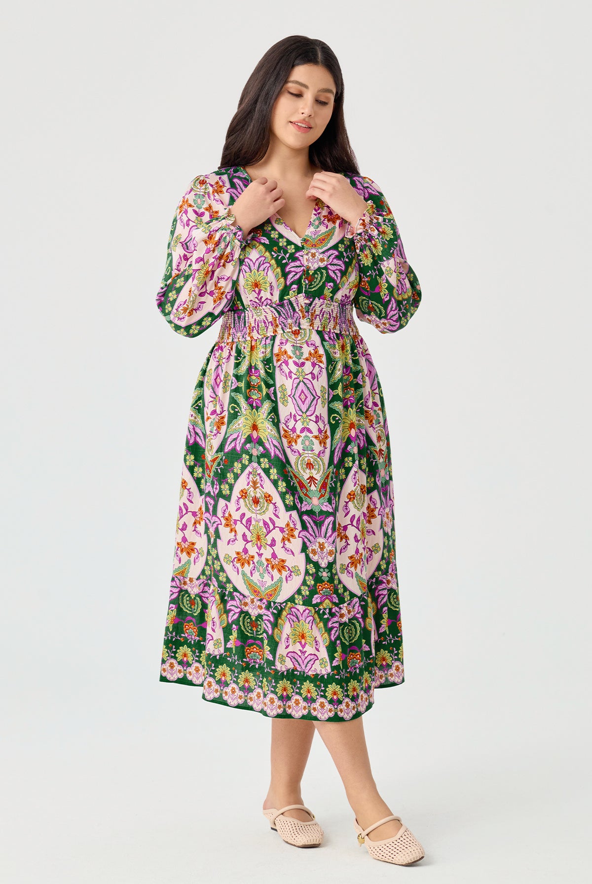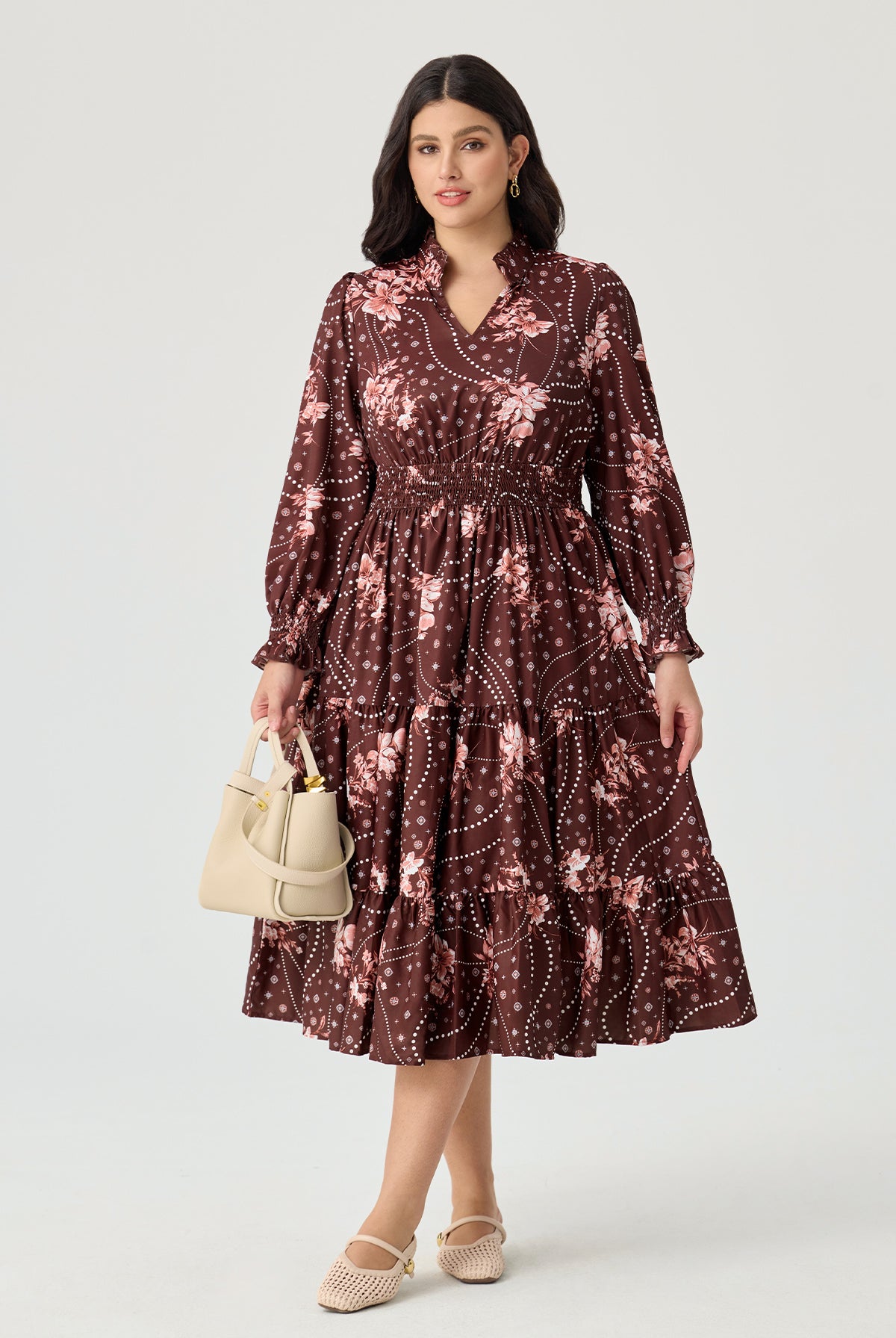 Ritera – Gerafftes Midikleid mit Knopfleiste, Blumenmuster und Polokragen