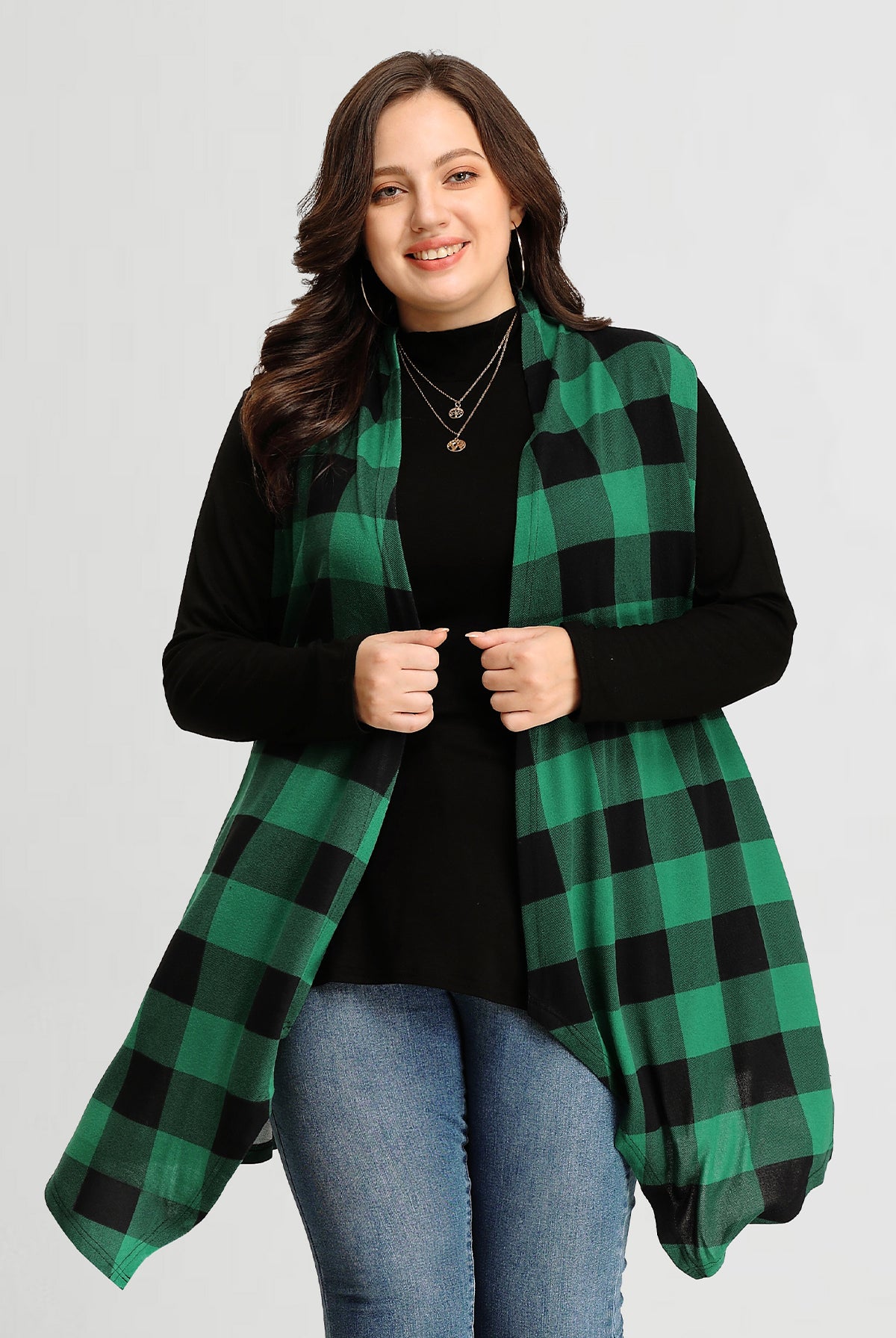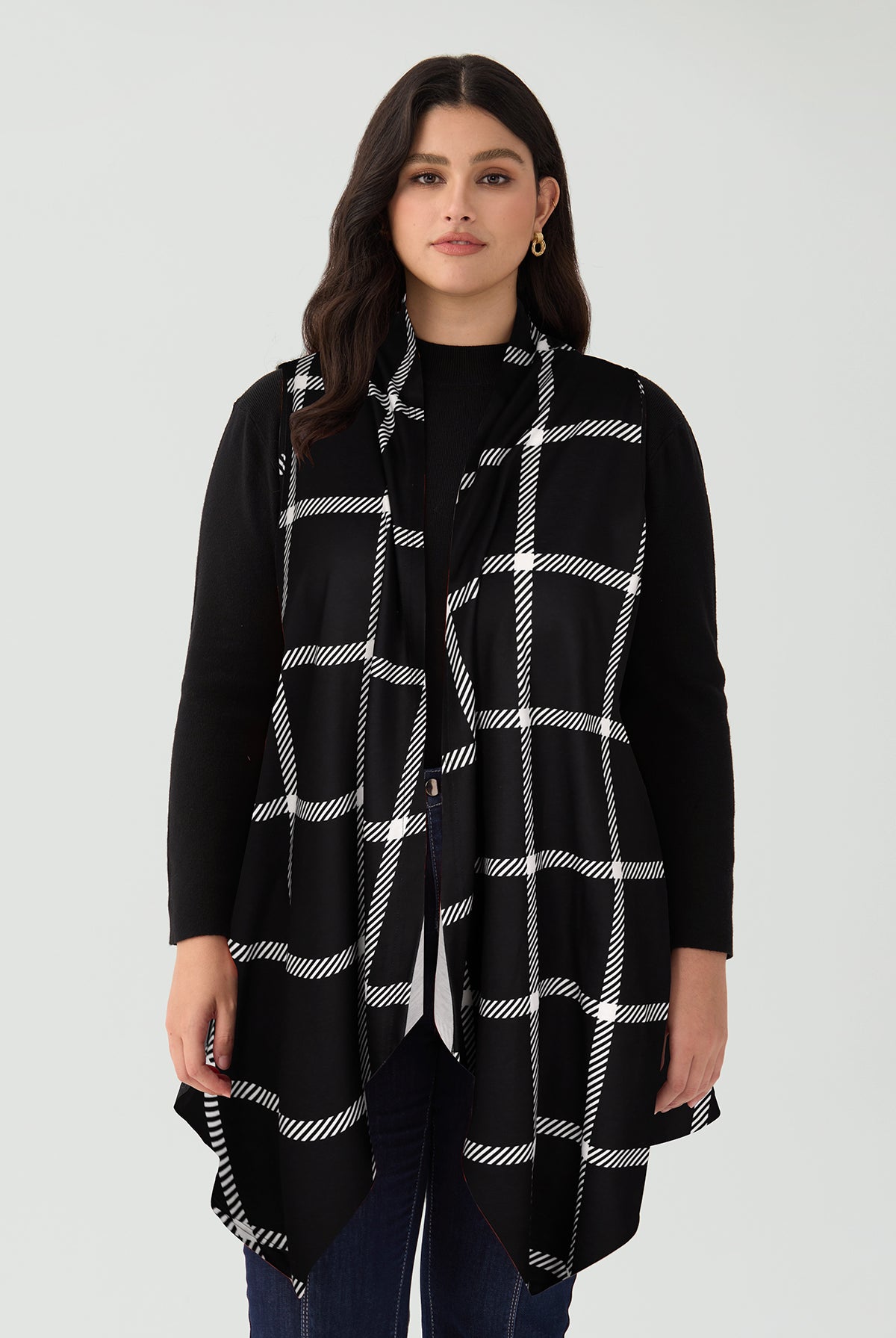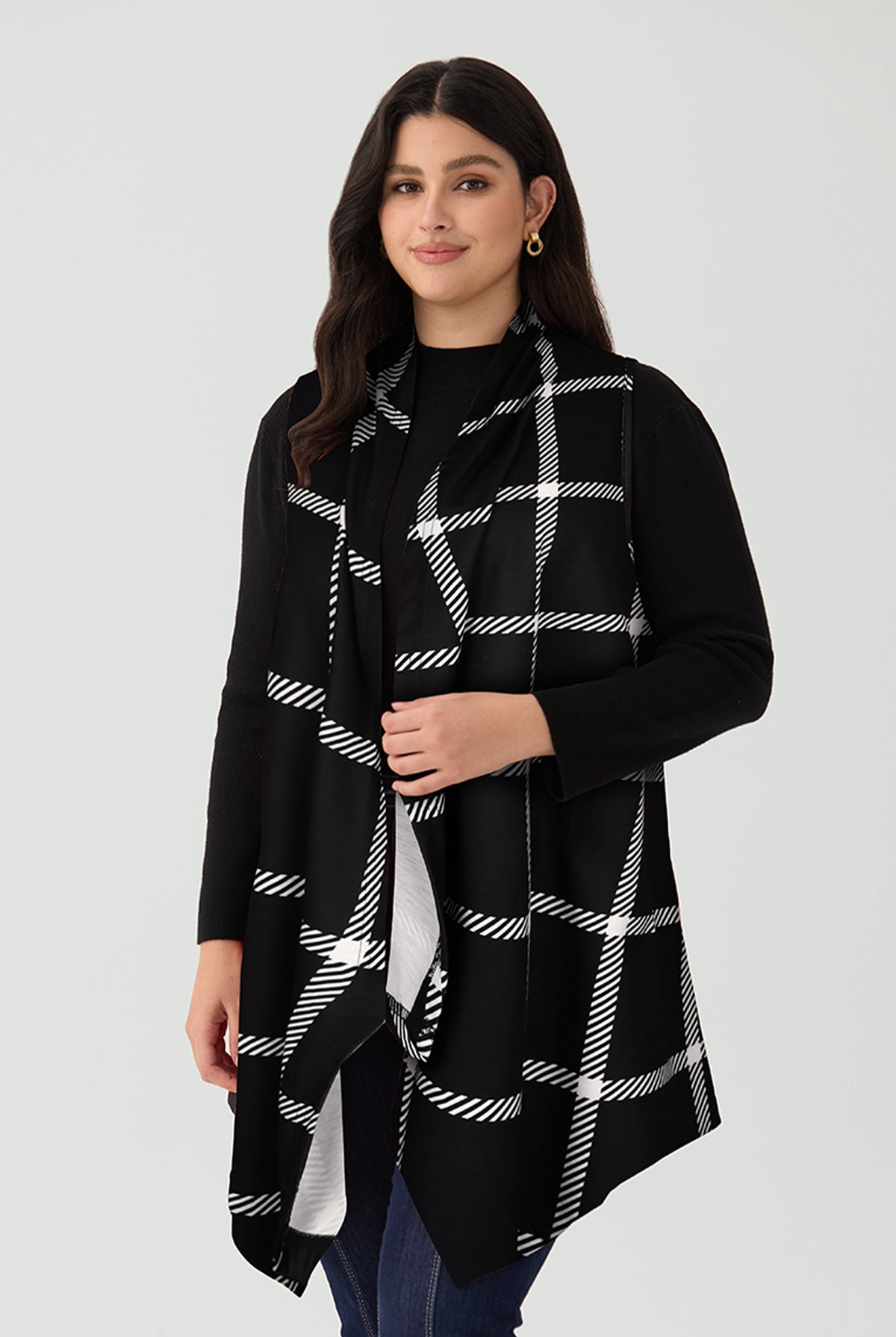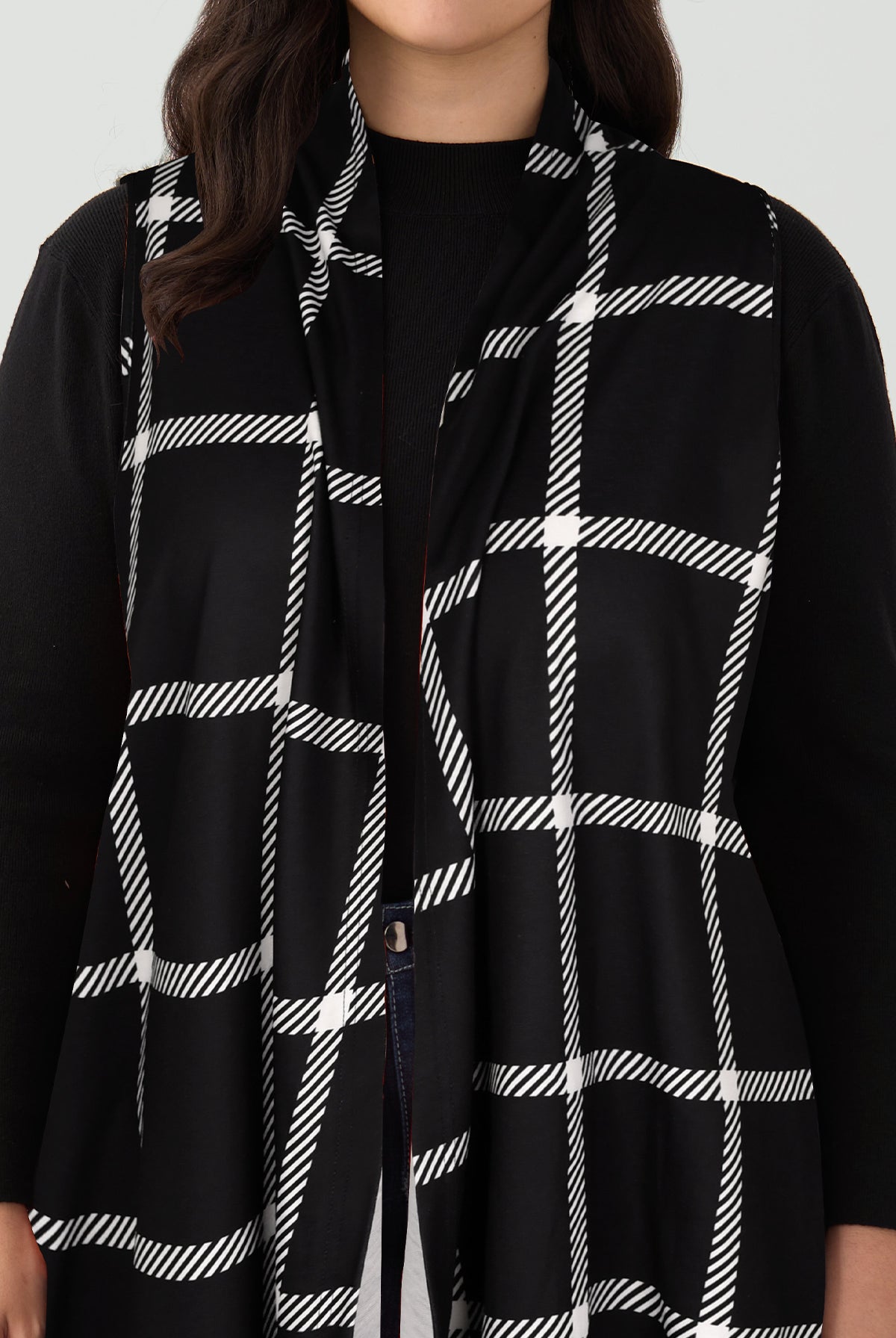 Langer ärmelloser Mantel mit Karomuster und Streifen