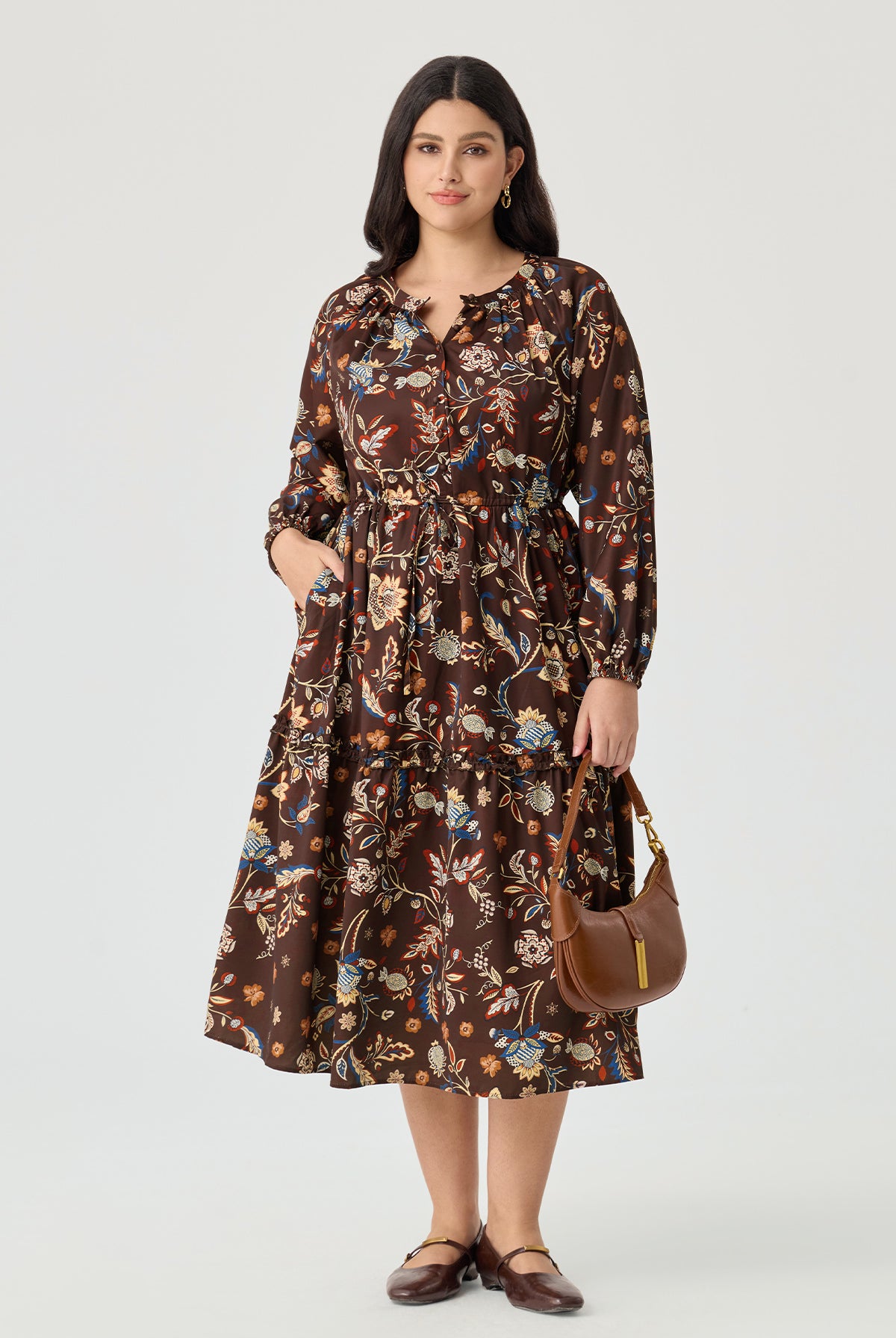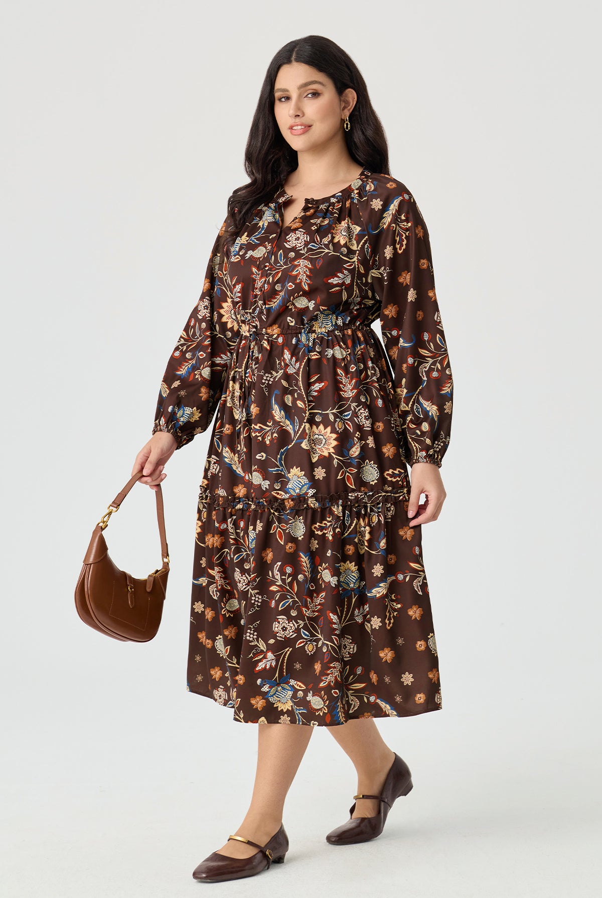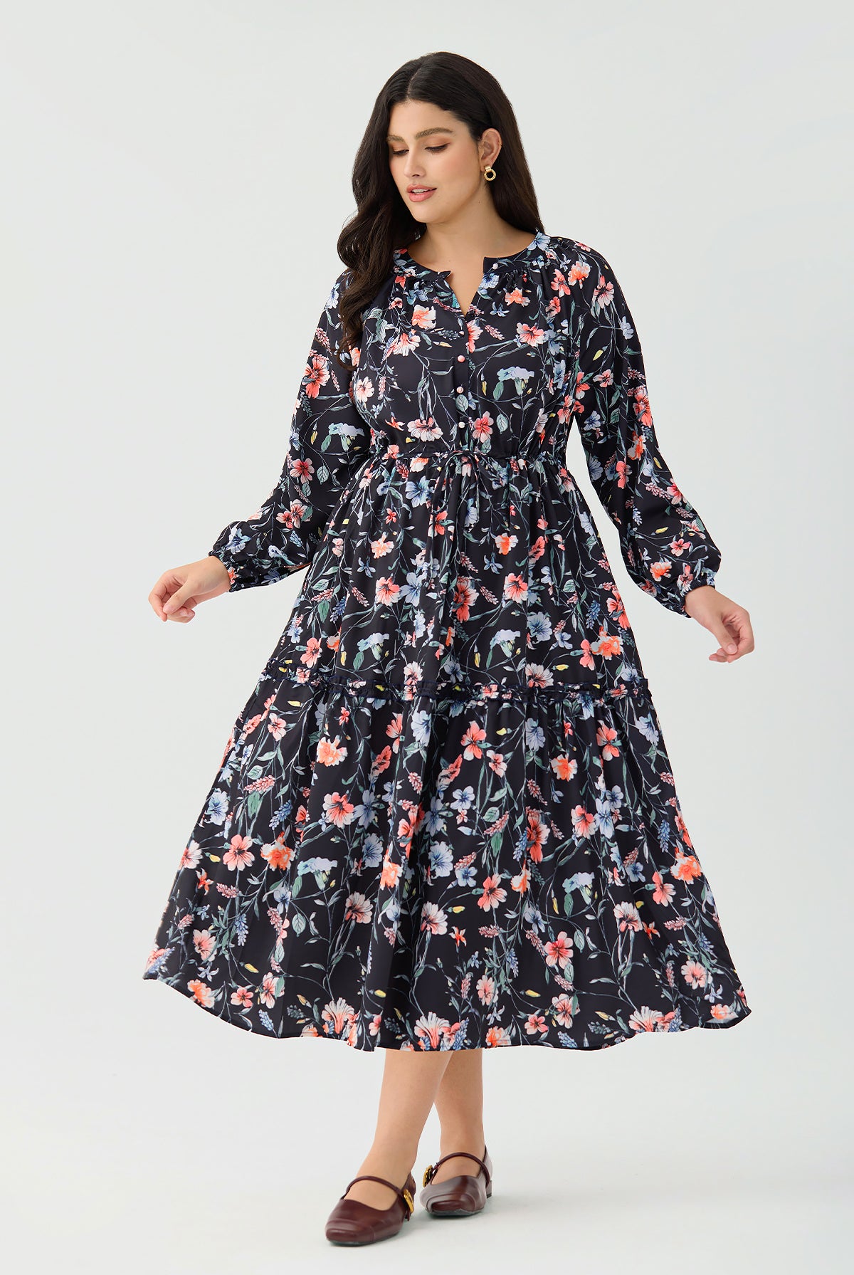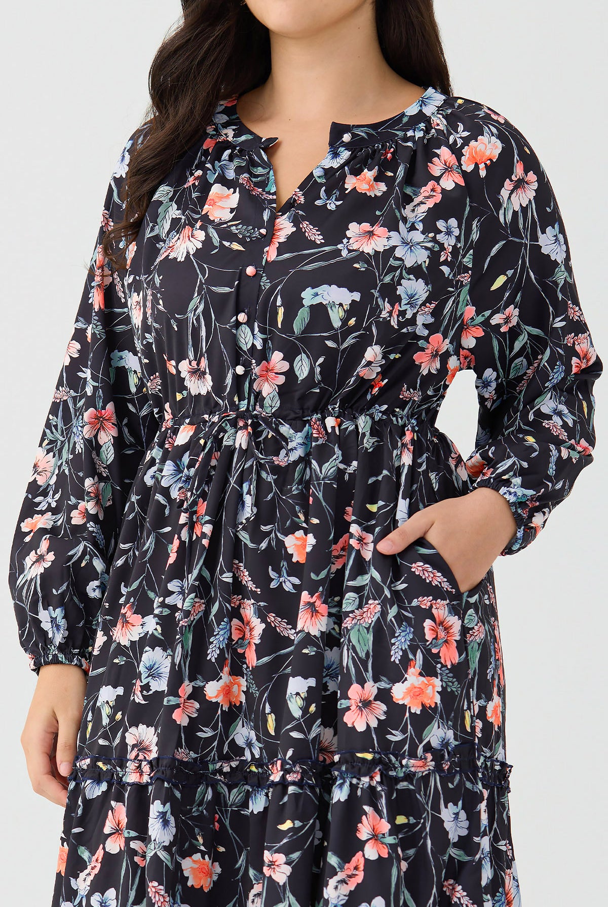 Ritera – Gerafftes Midikleid mit Knopfleiste, Blumenmuster und Polokragen