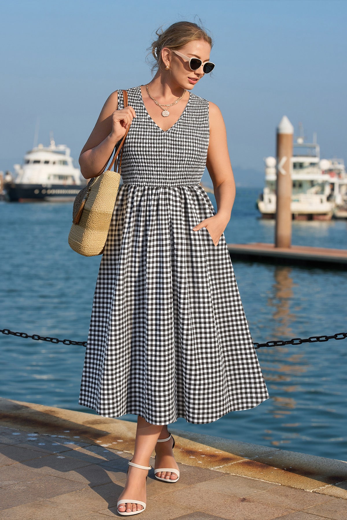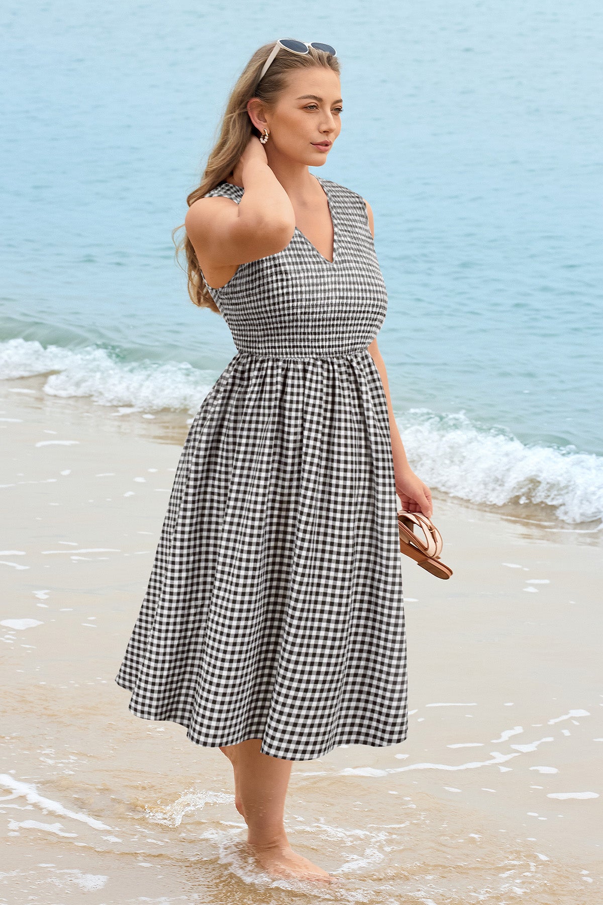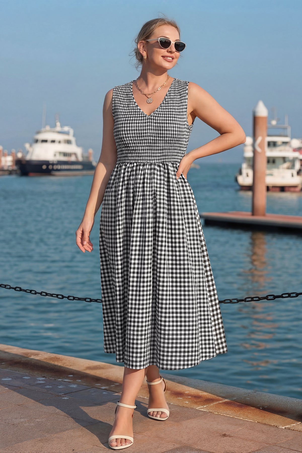 This romantic midi dress features a stretchy smocked bodice for a flexible, custom fit. Its sleeveless design keeps you cool and airy, while the elasticated waist flatters your figure—paired with a flowy A-line skirt for effortless, feminine comfort and charm.