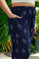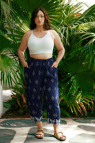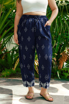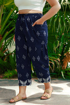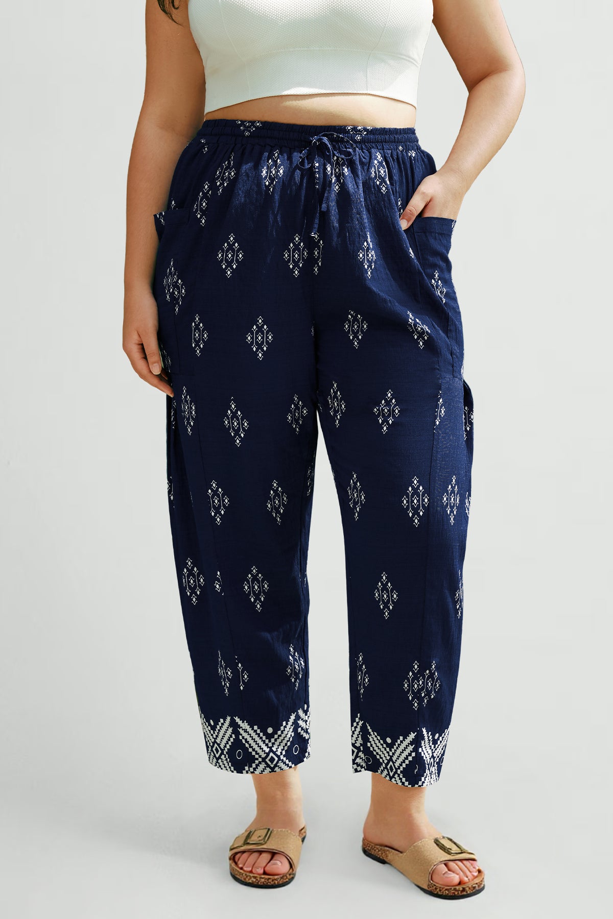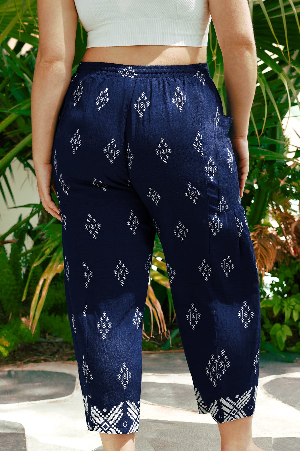 Diese Hose ist perfekt für Ihren Urlaub. Sie besticht durch einen dunkelblauen Grundton mit klaren, weißen geometrischen Tribal-Motiven, die für einen Hauch von Eleganz sorgen. Der hoch taillierte, elastische Kordelzugbund passt zu jeder Figur, und die entspannte Palazzo-Silhouette ist perfekt für Crop-Tops.