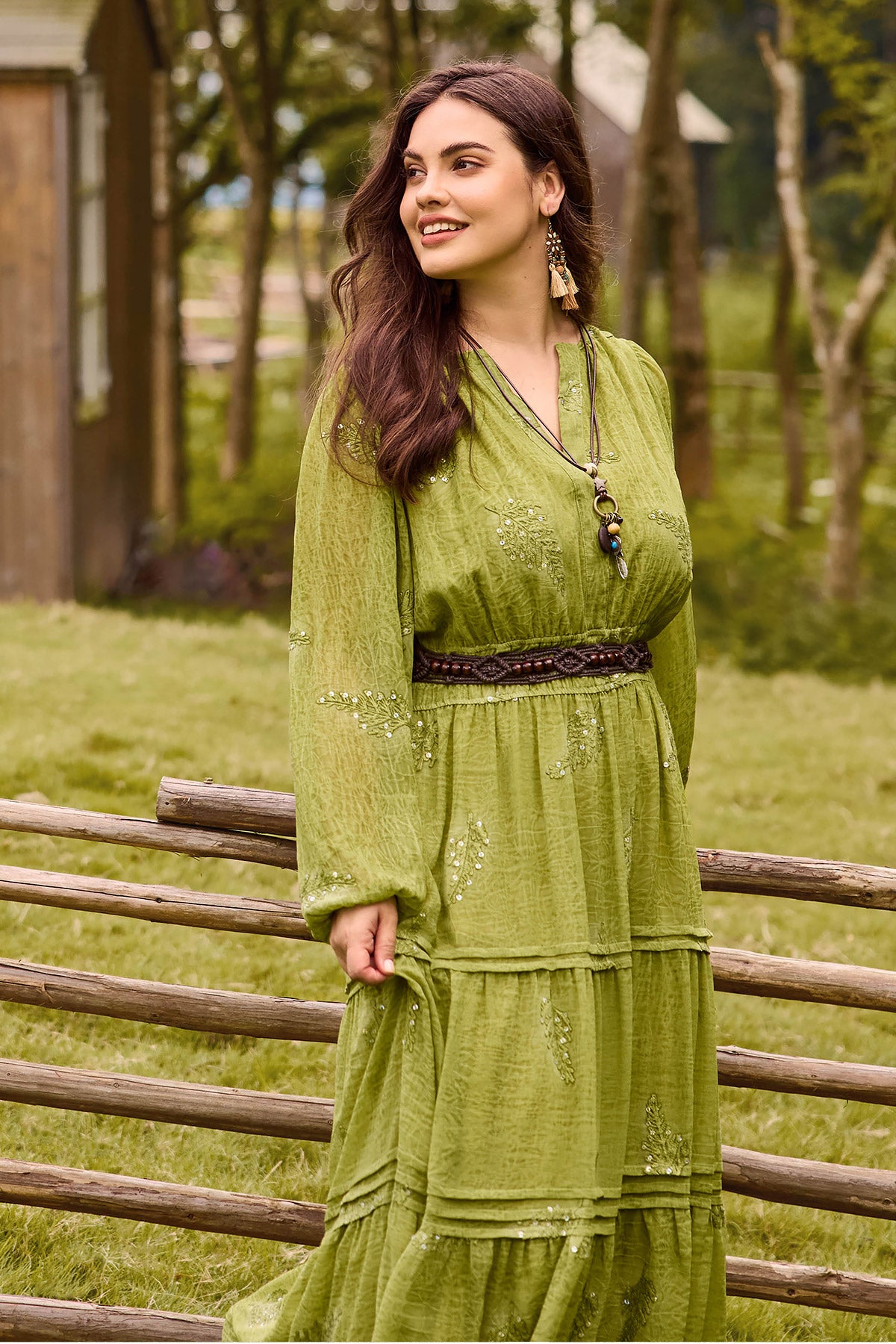 Sequin Embroidery Leaves Smocked Waist Tiered Midi Dress