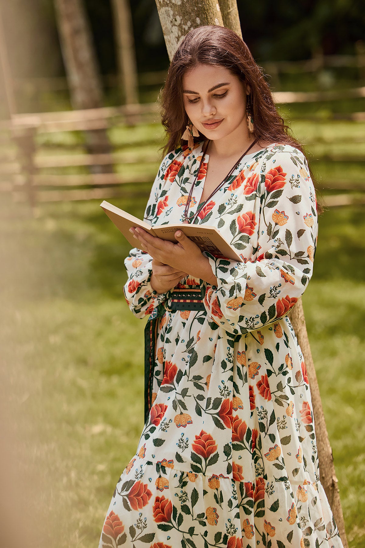 Floral Print Belted Long Sleeves Shirt Midi Dress