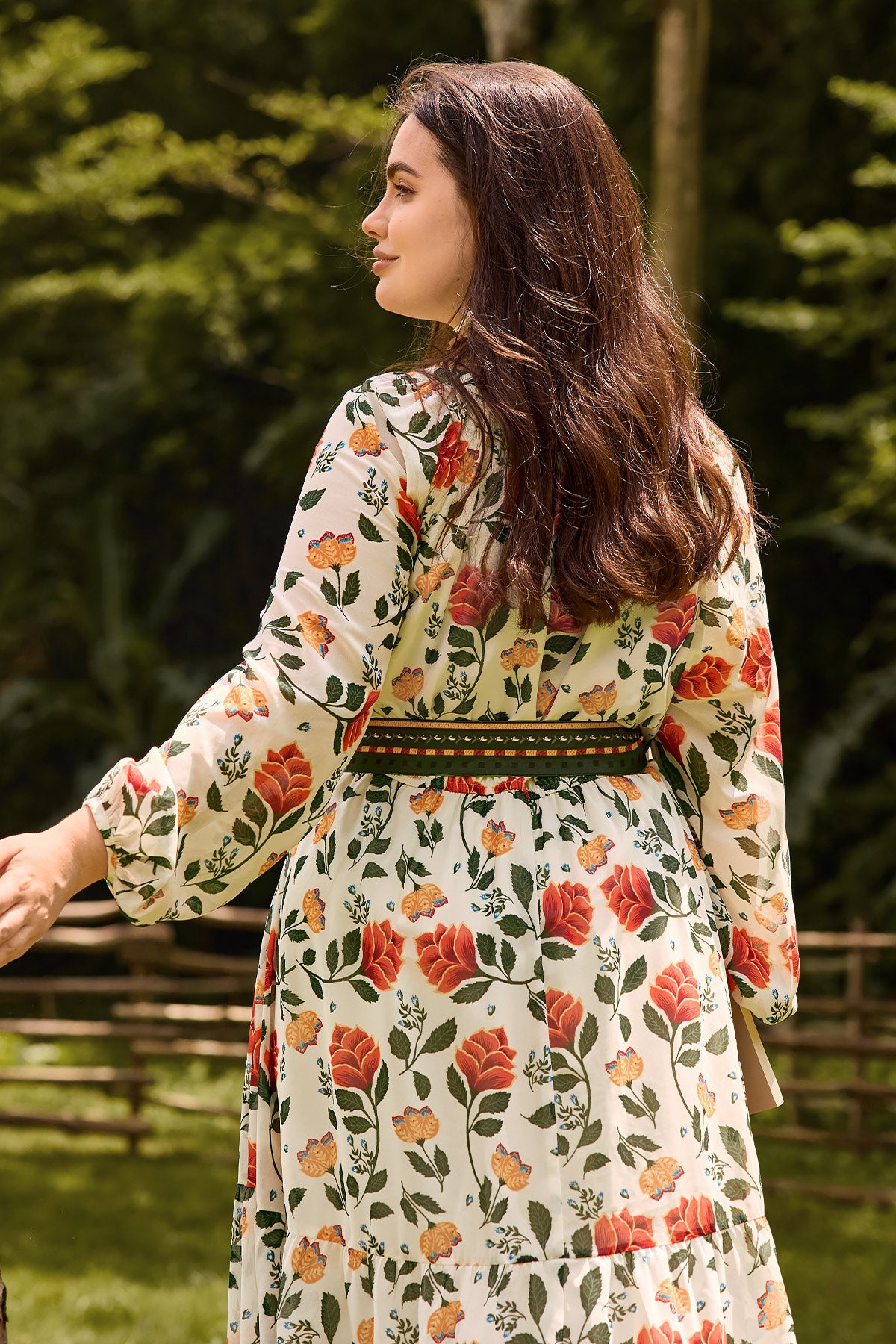 Orange-red florals, green leaves, and yellow blooms create a soft vintage vibe. The reversible belt echoes the placed floral design at the hem.