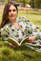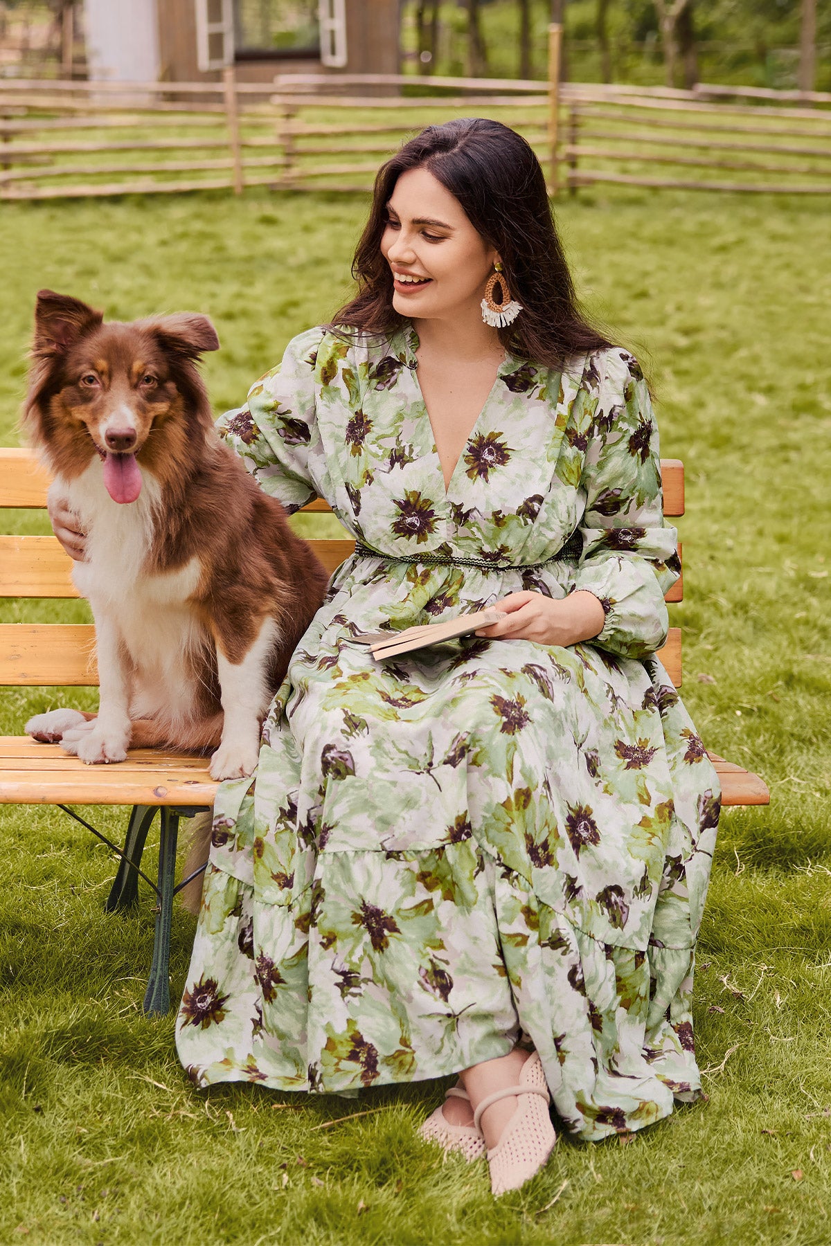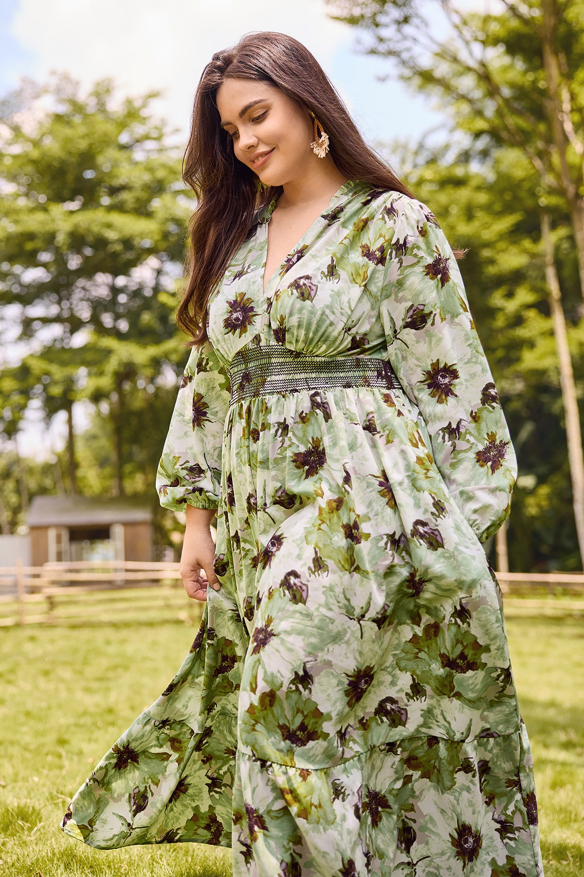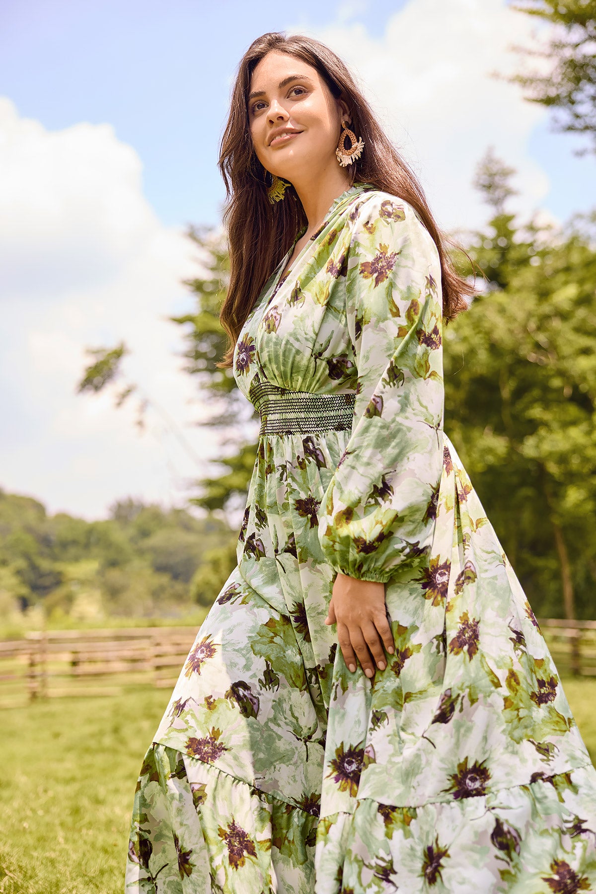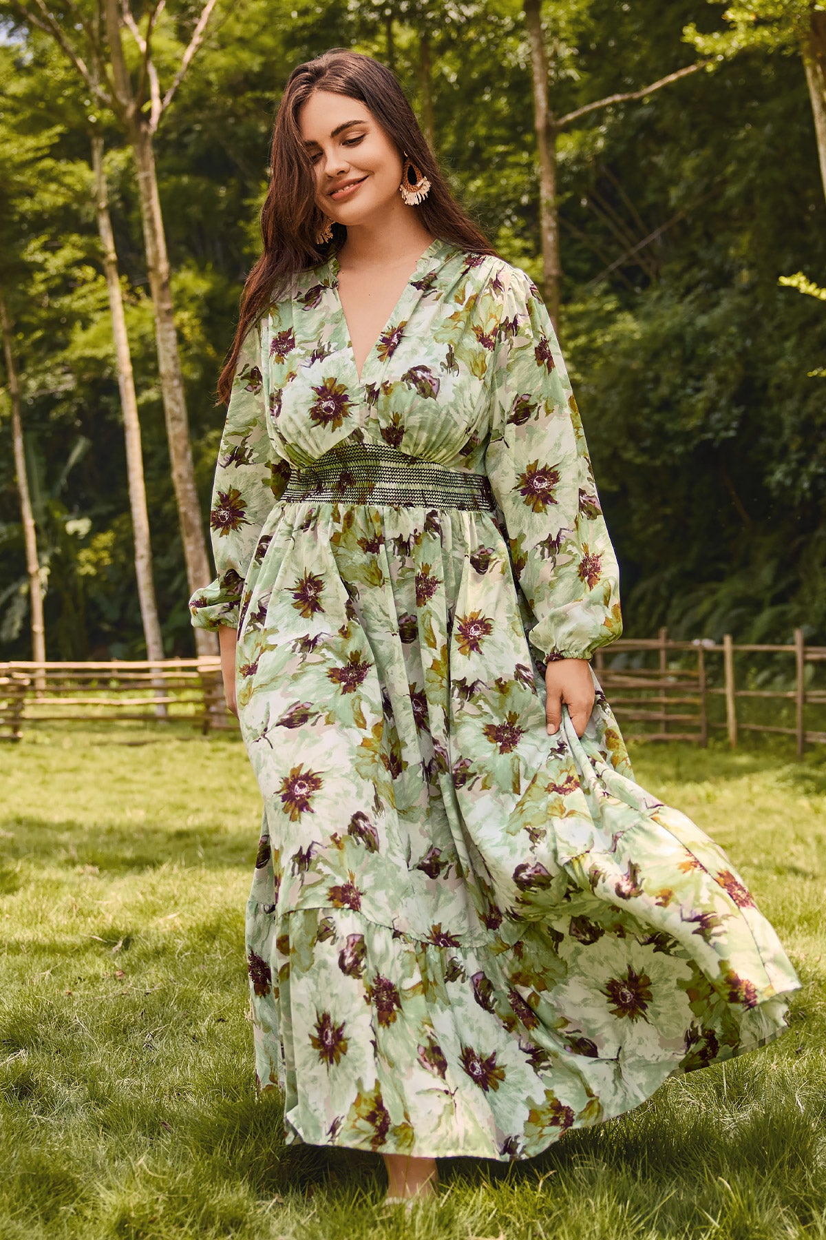 Embrace effortless charm with our Green Floral Smocked Plus Size Midi Dress.The chic V-neckline and tiered midi skirt create a graceful silhouette, while the elegant long sleeves add a touch of sophistication. With its blend of bohemian style and modern comfort, this cottagecore-inspired dress includes convenient side pockets, making it both beautiful and practical. It's the perfect choice for anyone who loves a mix of romantic and relaxed style.