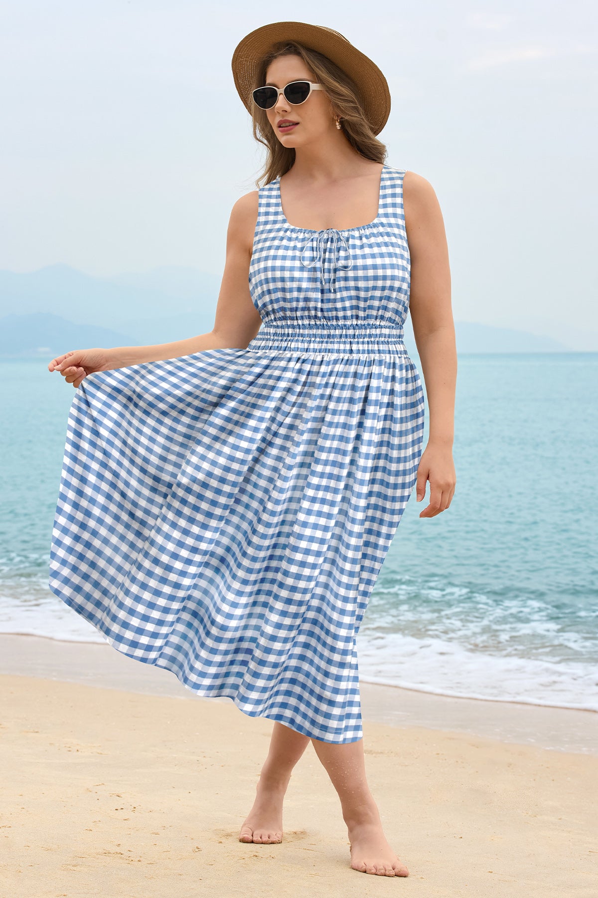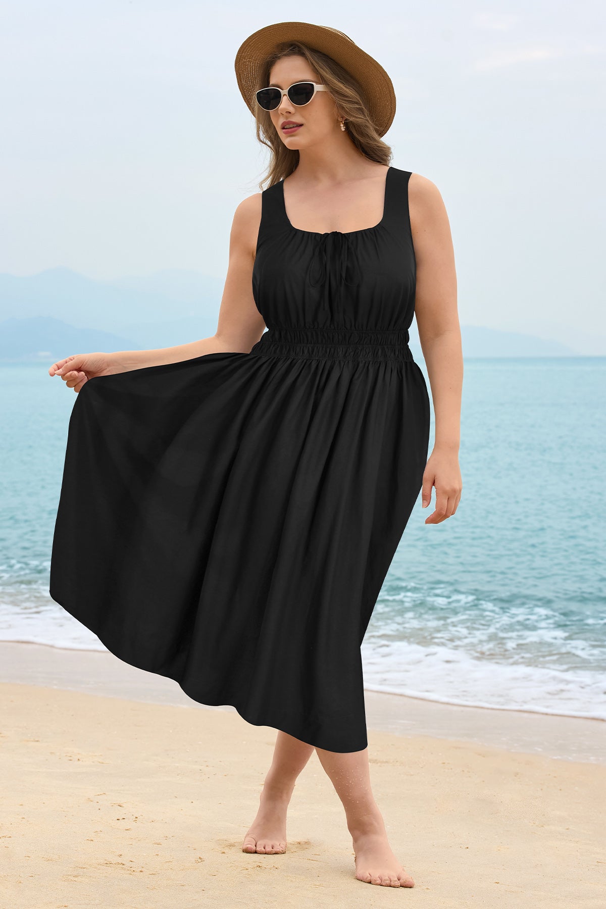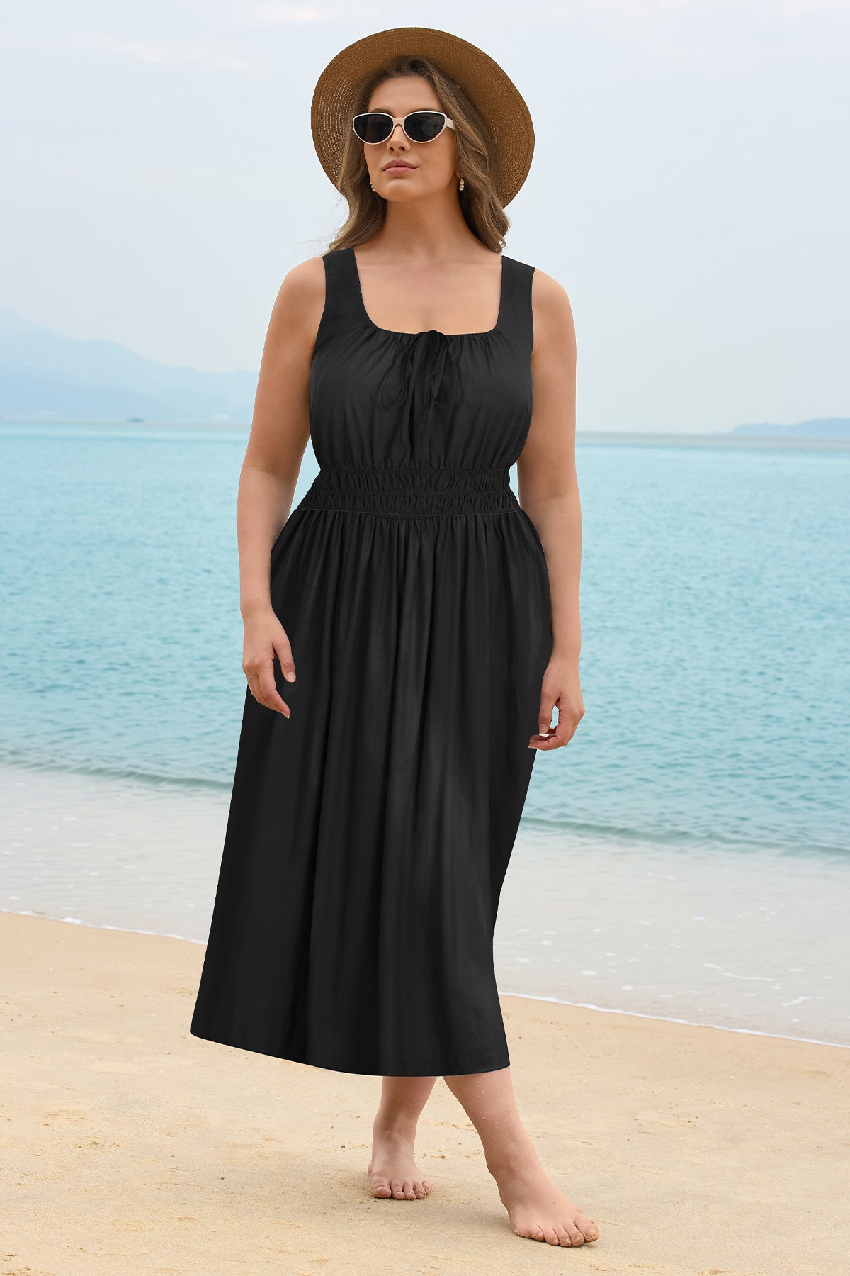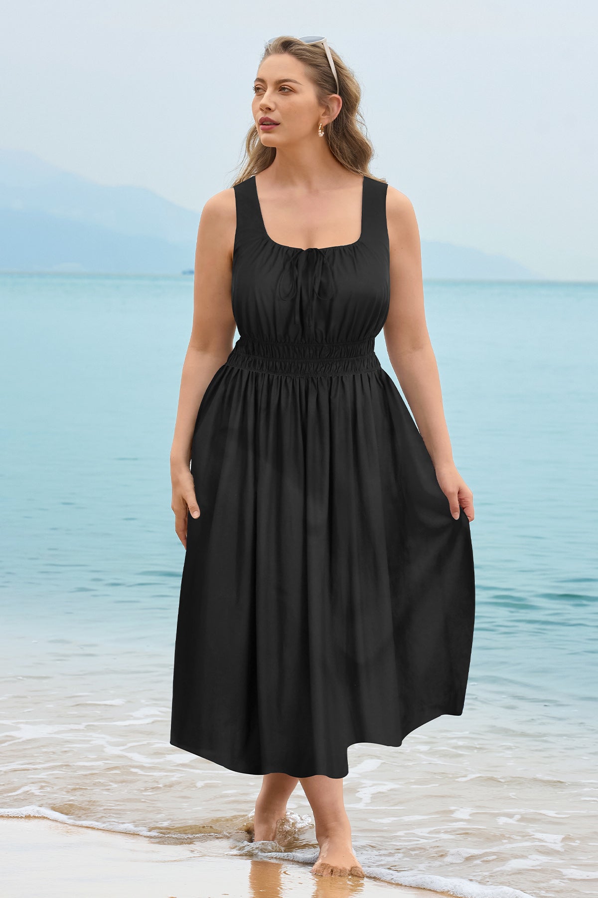 Pockets Elastic Scalloped Square Neck Midi Dress