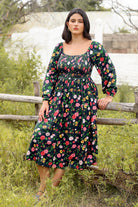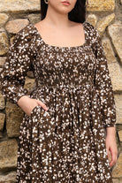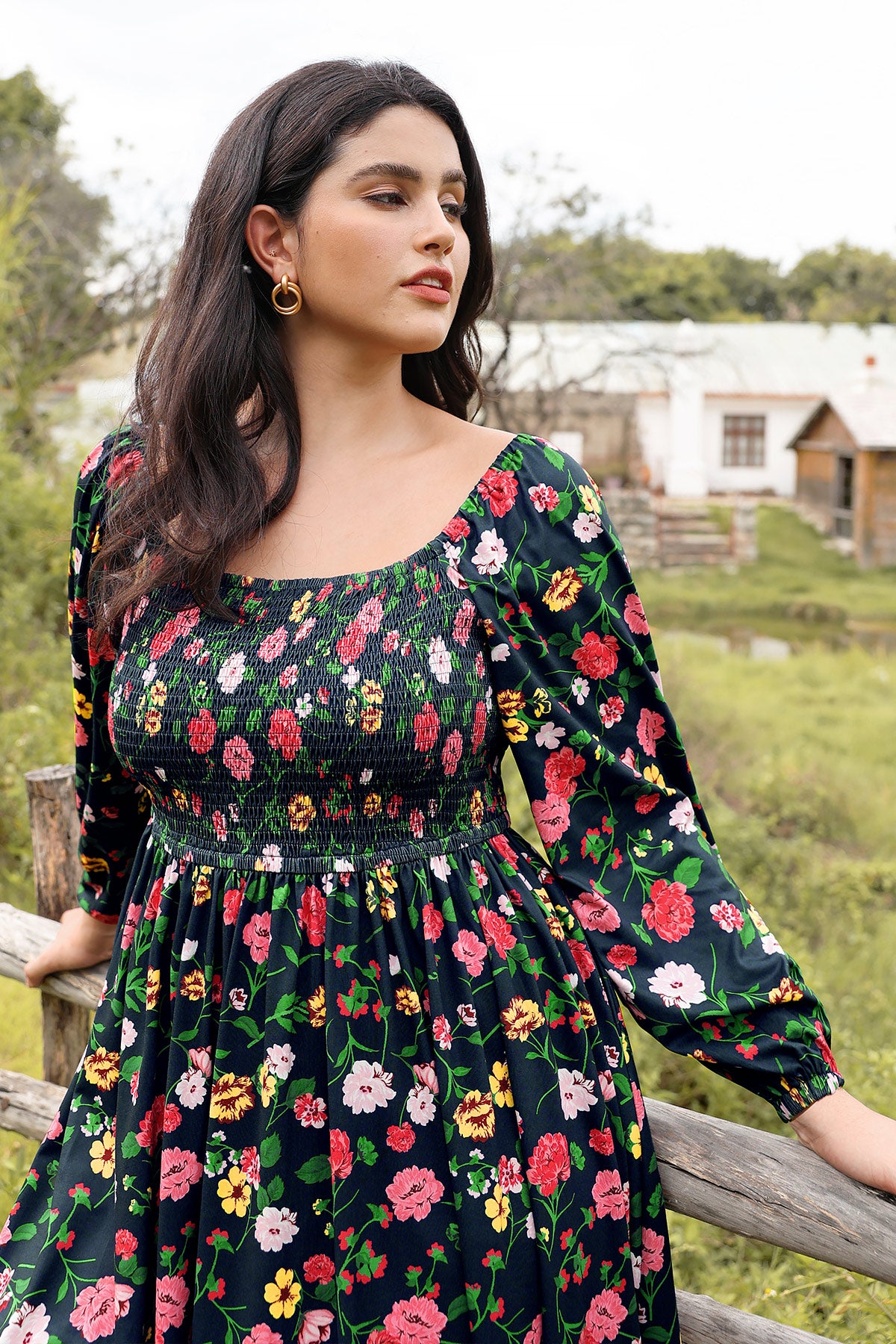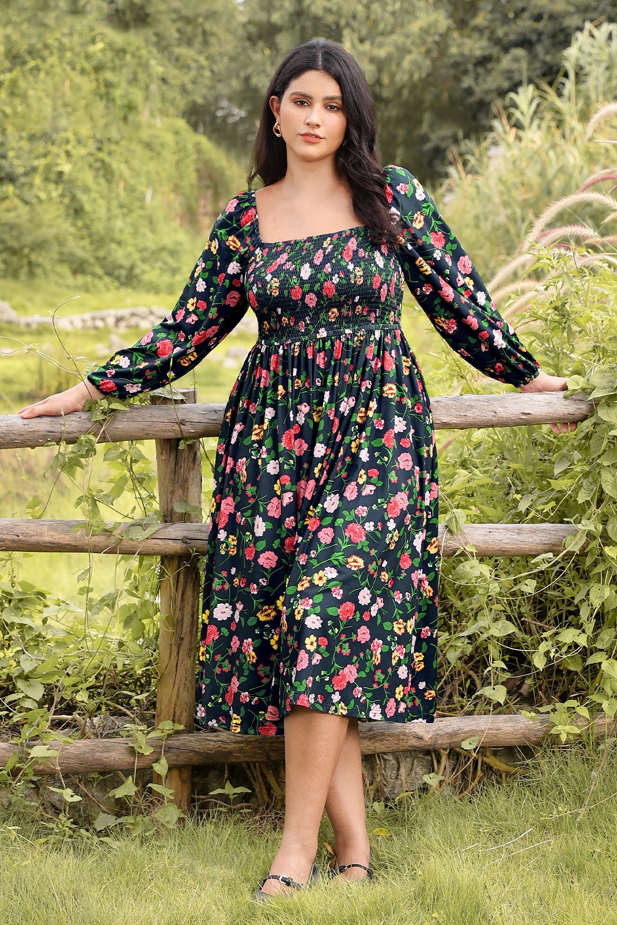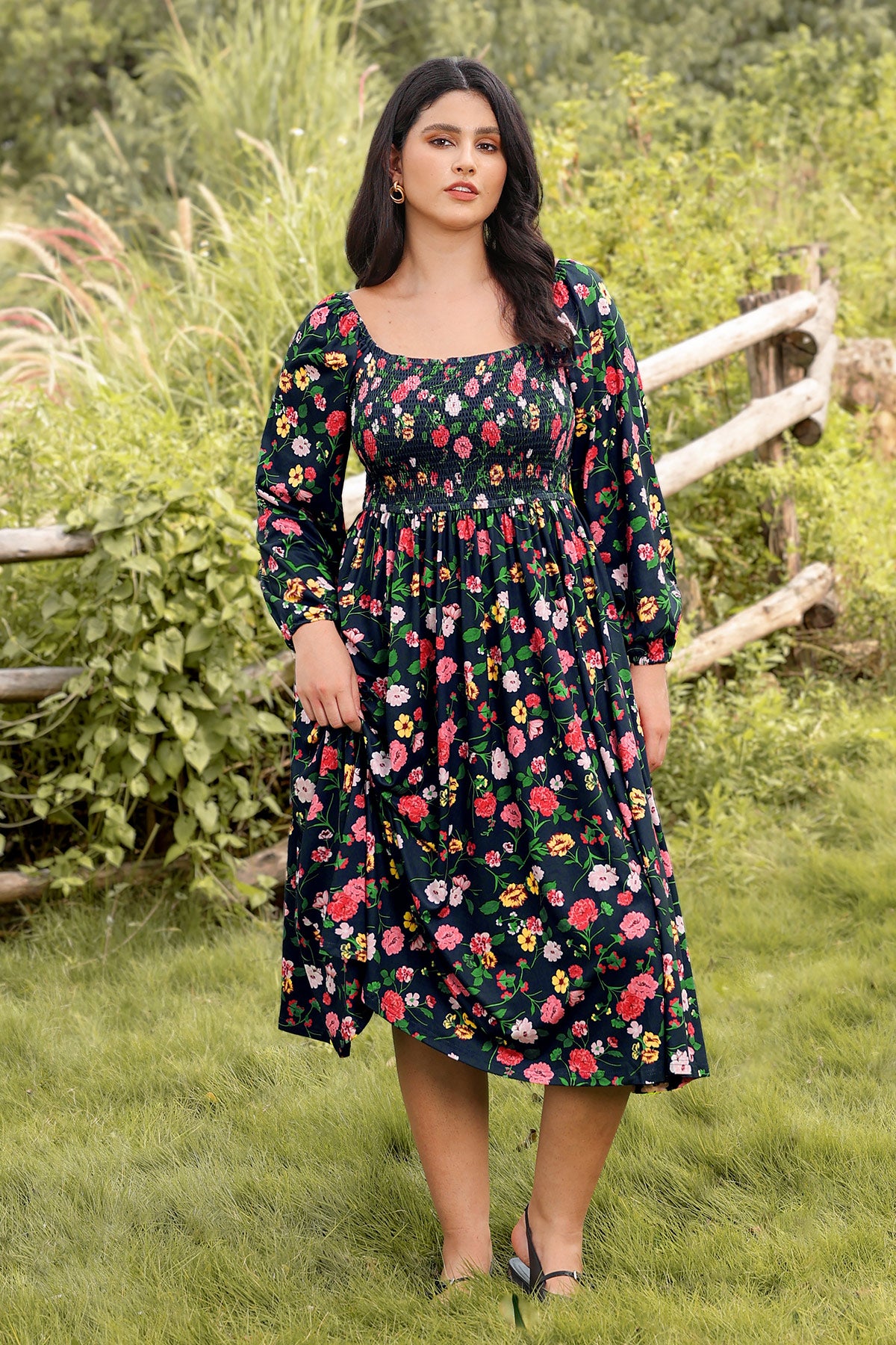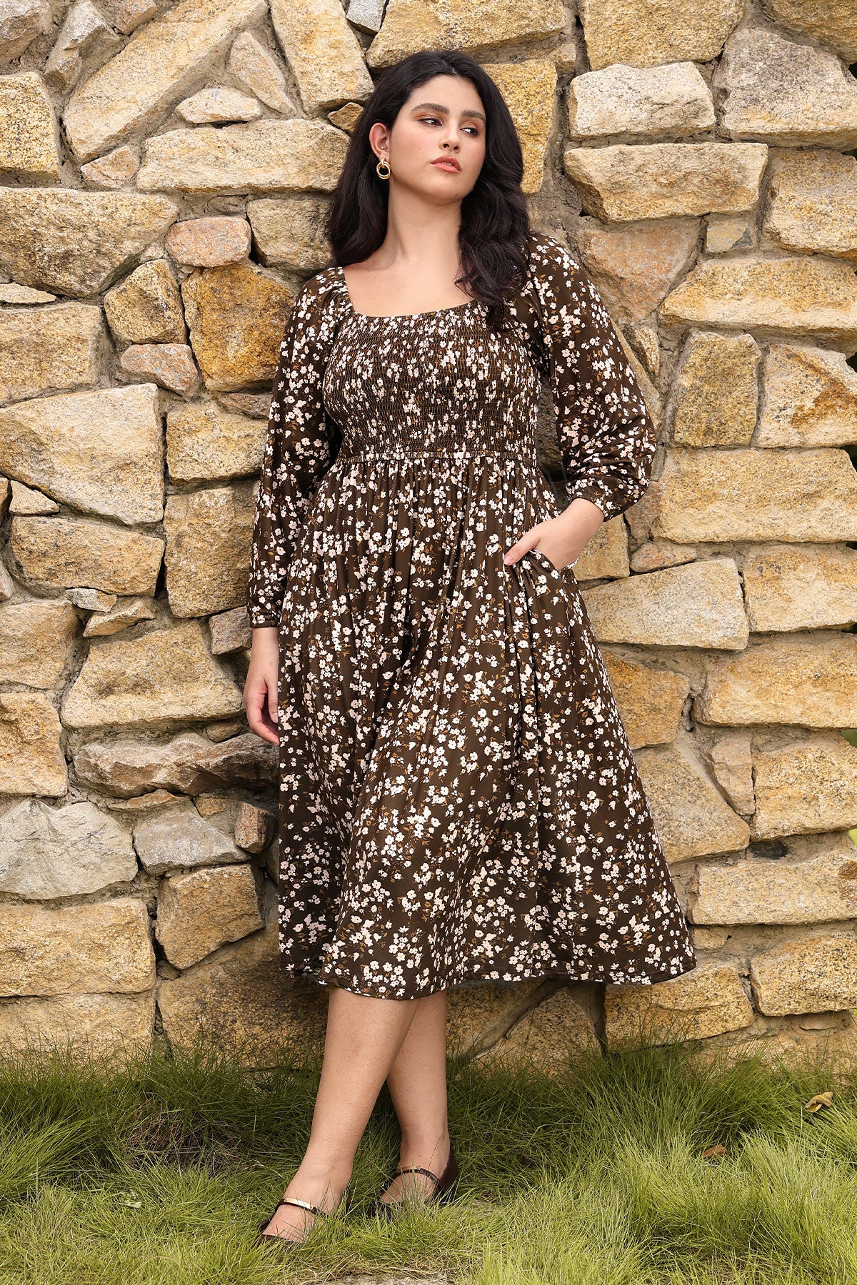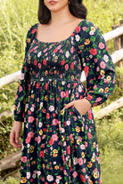 Ritera Pockets Chic Floral Smocked Square Neck Midi Dress