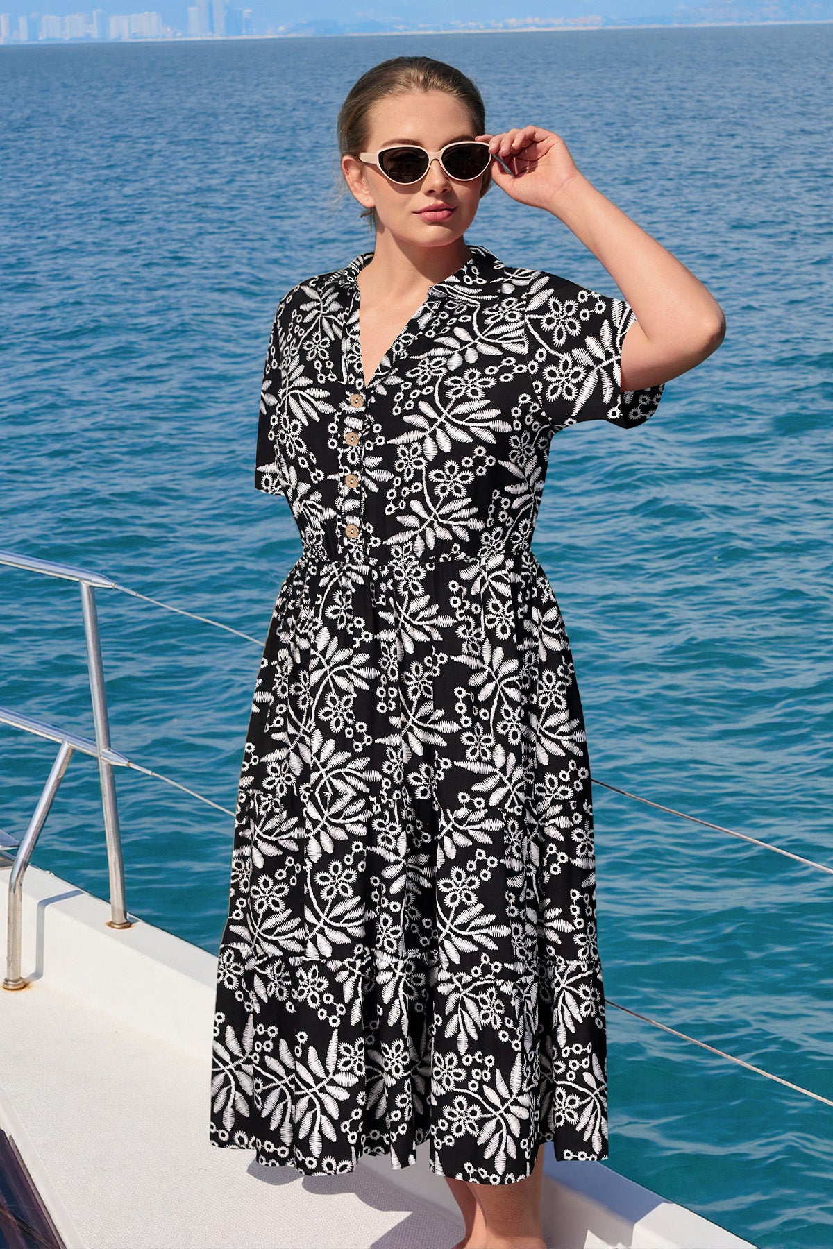 Schicker V-Ausschnitt und kurze Ärmel mit klassischer Button-Down-Front