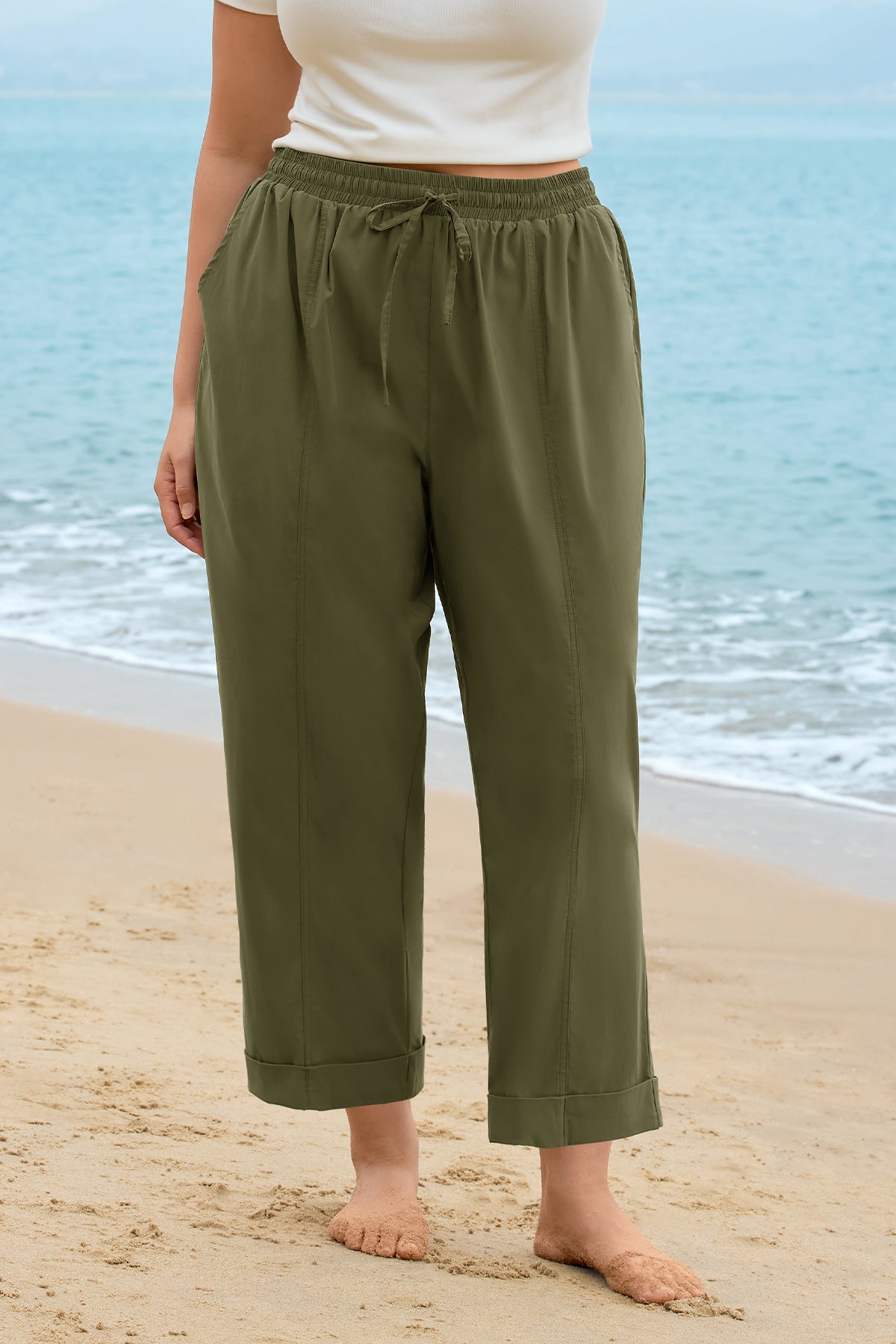 This versatile cropped pant features a timeless solid olive green hue that’s endlessly easy to style. Its adjustable drawstring waist ensures a personalized, comfortable fit, while handy side pockets add everyday convenience—paired with a relaxed straight-leg silhouette and rolled cuffs, it balances casual ease and effortless all-day comfort.