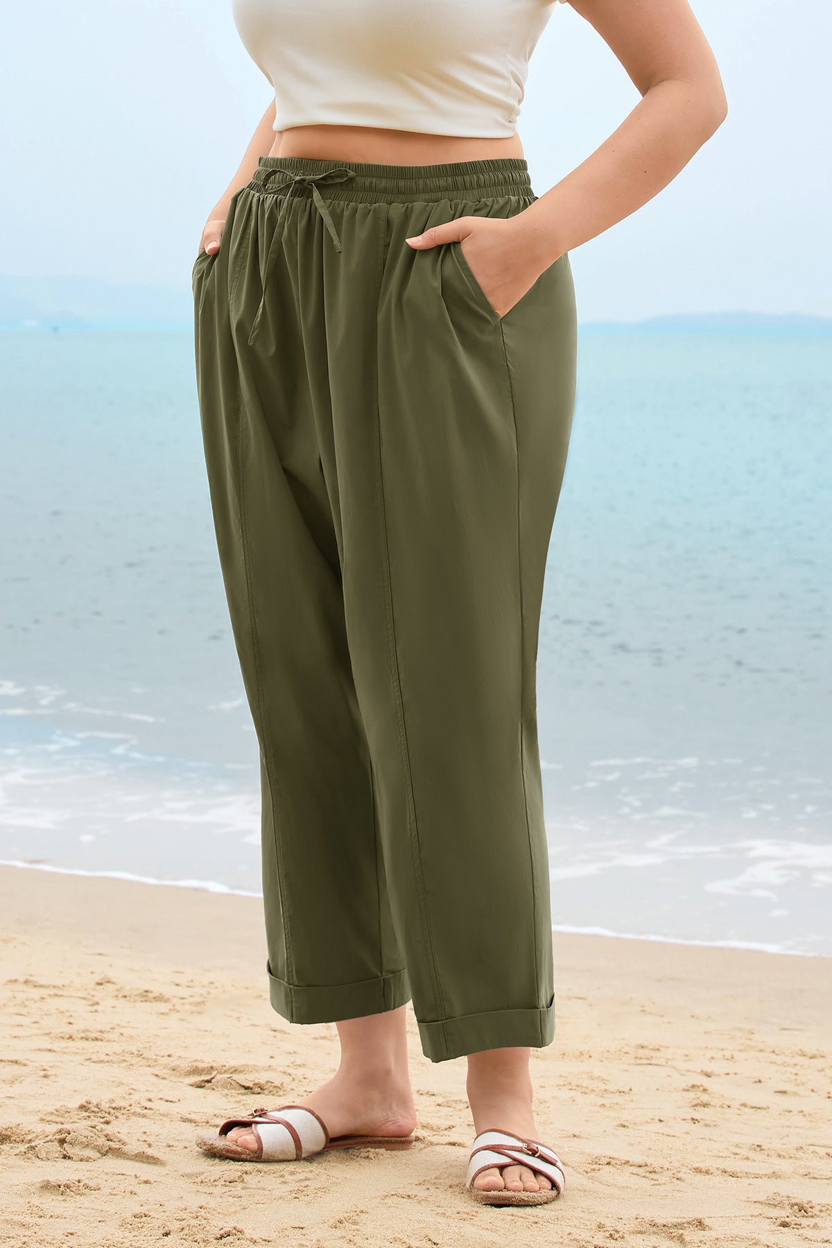 Solid Olive Green Drawstring Waist Cropped Pants