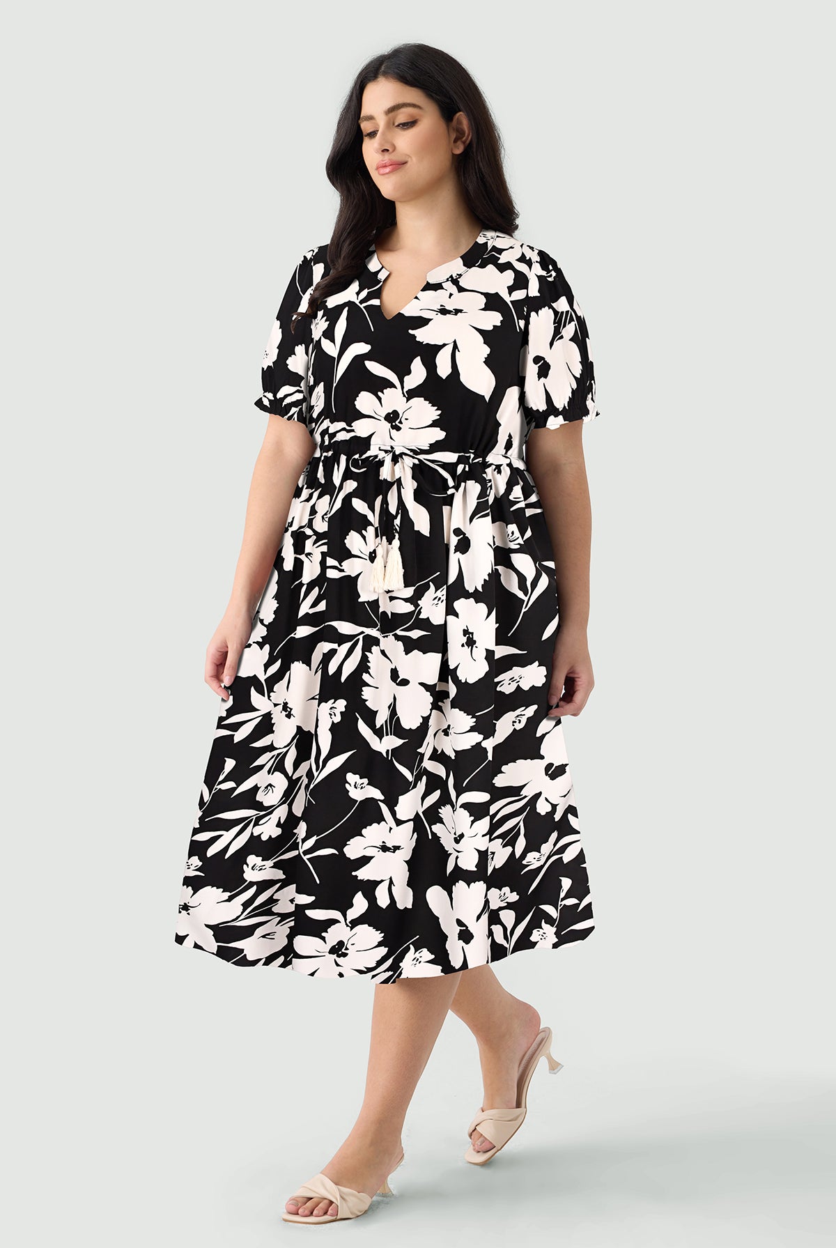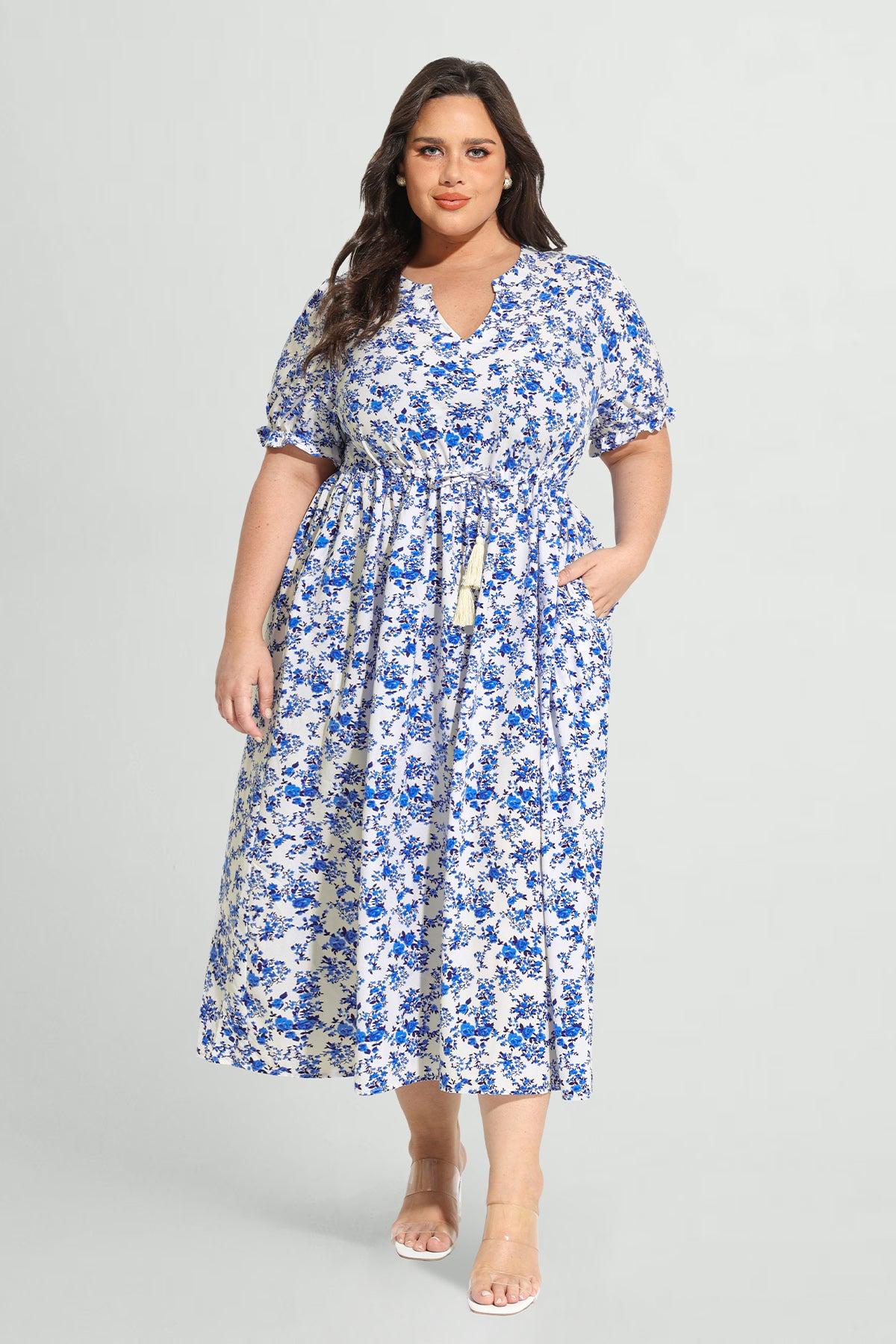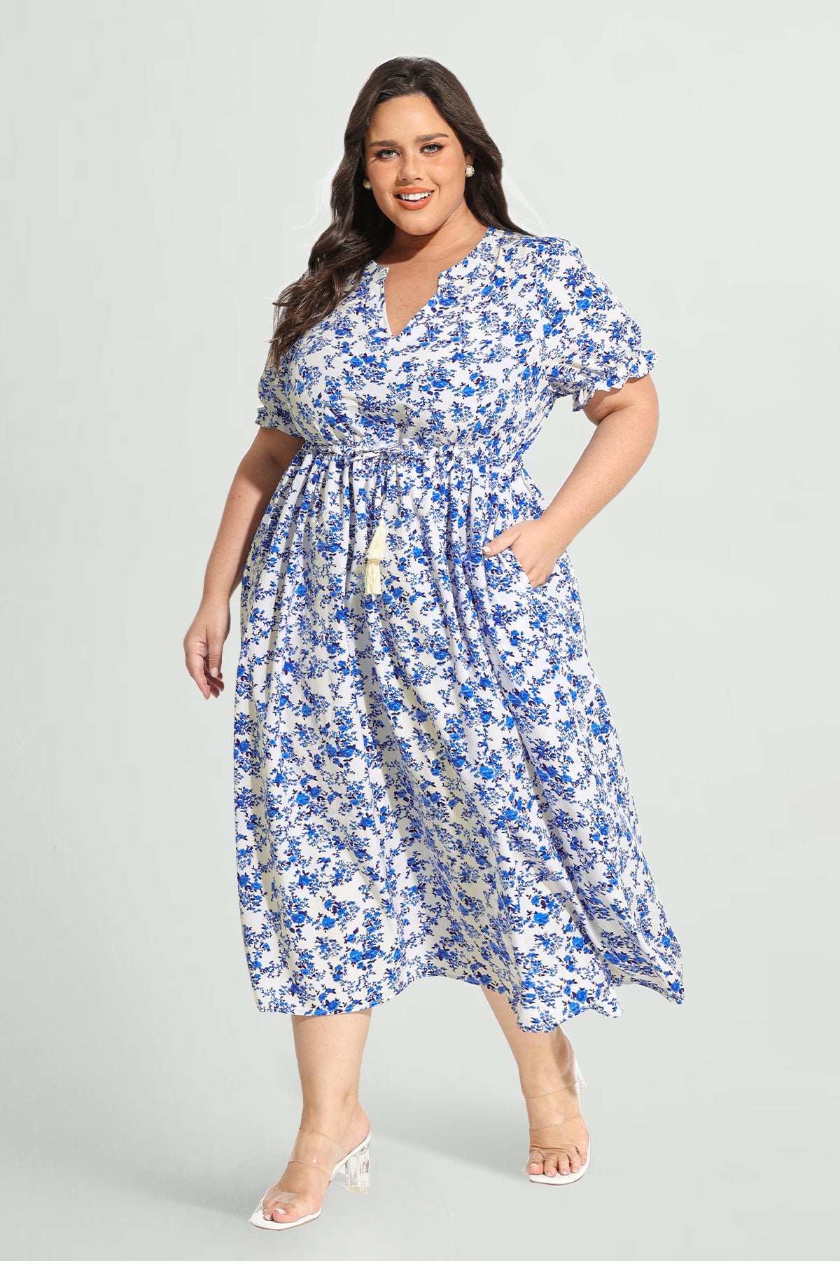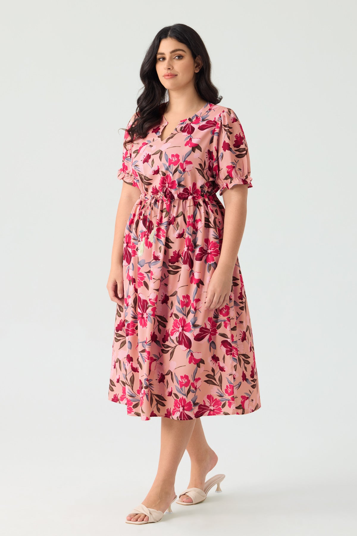 Robe mi-longue trapèze à fleurs avec cordon de serrage et poches Ritera