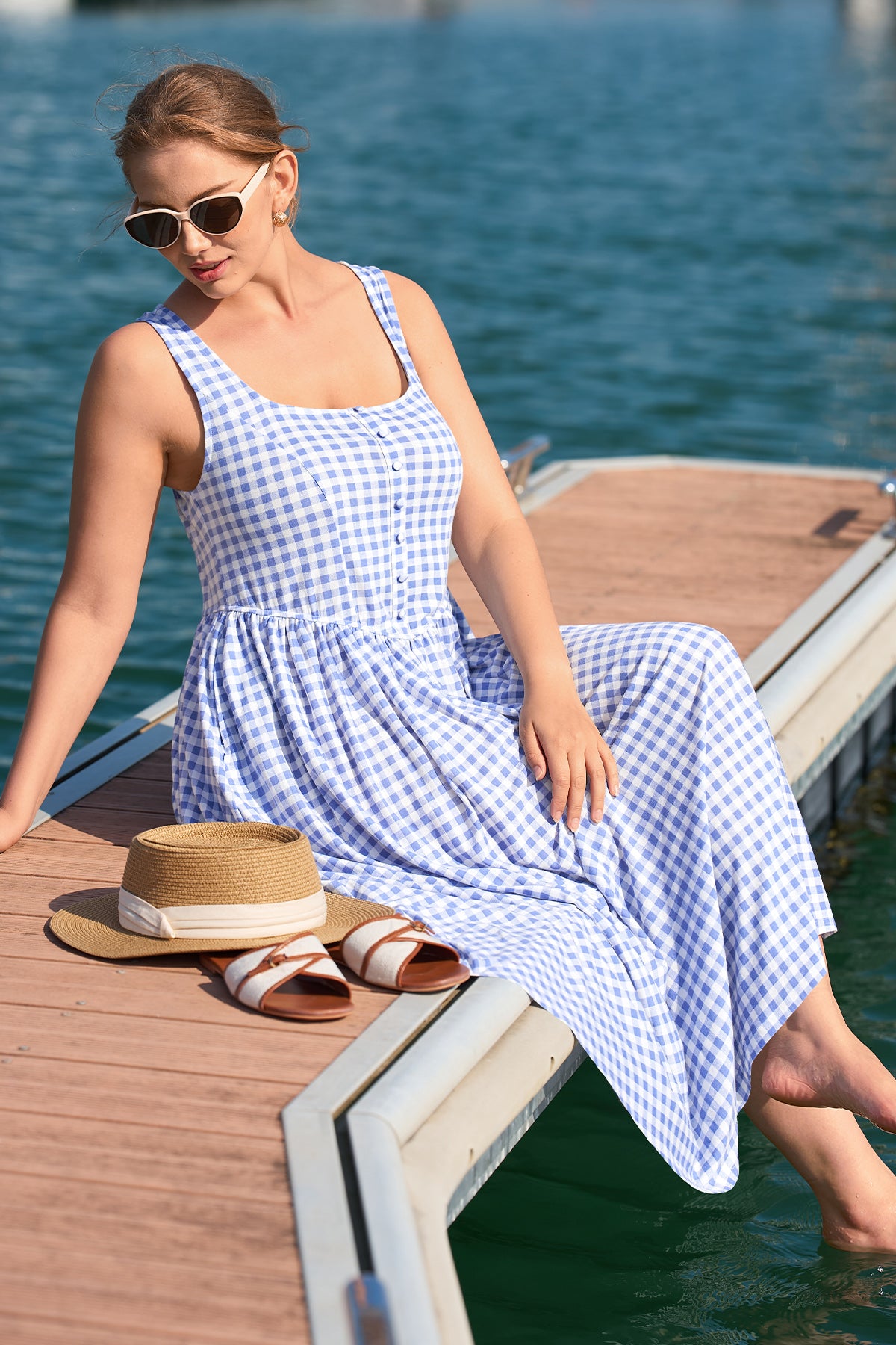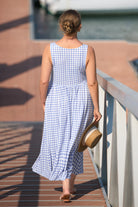This fresh midi dress features a classic blue gingham print that feels timeless and charming. Its sleeveless cut offers breezy comfort, while the square neckline and fitted bodice flatter your silhouette—paired with a flowy A-line skirt that moves smoothly, balancing casual charm and effortless style.