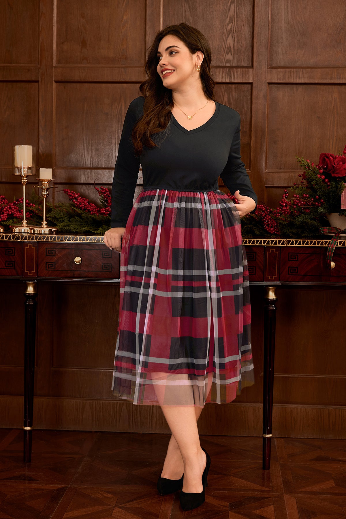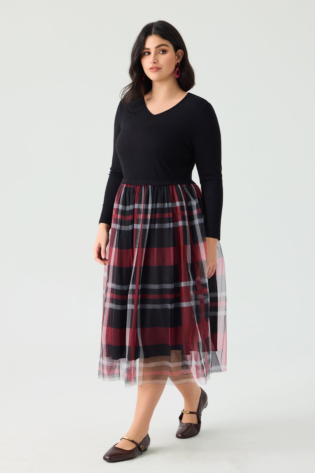 Robe mi-longue à carreaux et col ras du cou en tulle à blocs de couleurs Ritera