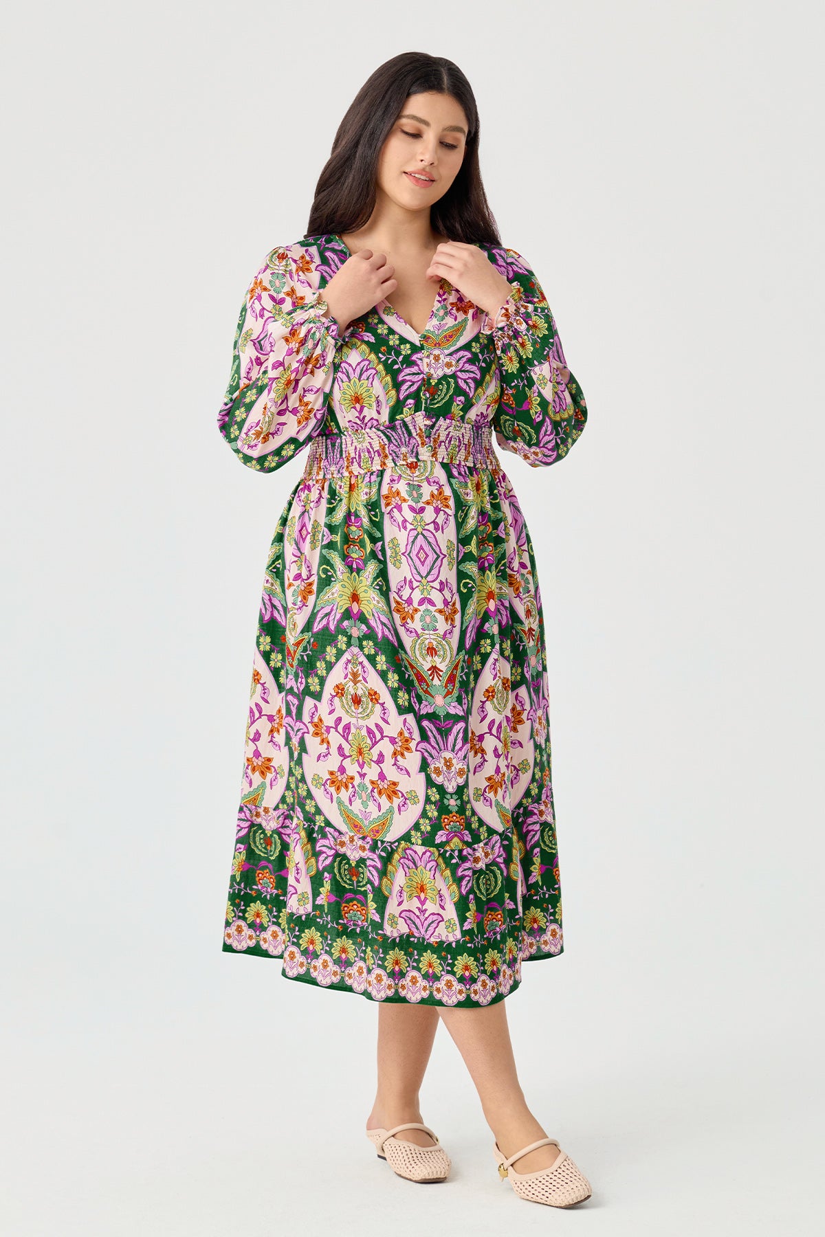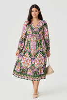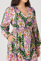 Unleash your inner free spirit with our Boho Paisley Tiered Midi Dress. This enchanting dress features a unique and intricate paisley pattern in a beautiful mix of colors, creating a romantic and artistic look. The smocked waist and delicate tiered skirt provide a comfortable and flattering fit that flows beautifully with every step. The ruffled V-neckline and long sleeves add a touch of bohemian charm, making this dress perfect for any occasion where you want to feel both comfortable and elegant.