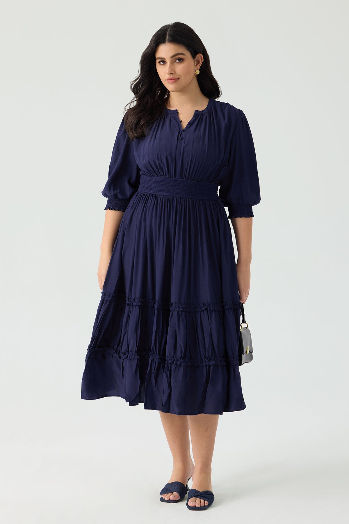 Elevate your wardrobe with this stunning plus-size navy blue dress designed to flatter curves and exude effortless elegance. The V-neckline and 3/4 sleeves with elastic cuffs offer a chic, comfortable fit, while the cinched waist accentuates your silhouette. The tiered ruffled skirt adds movement and femininity, perfect for creating a flowy, romantic look.