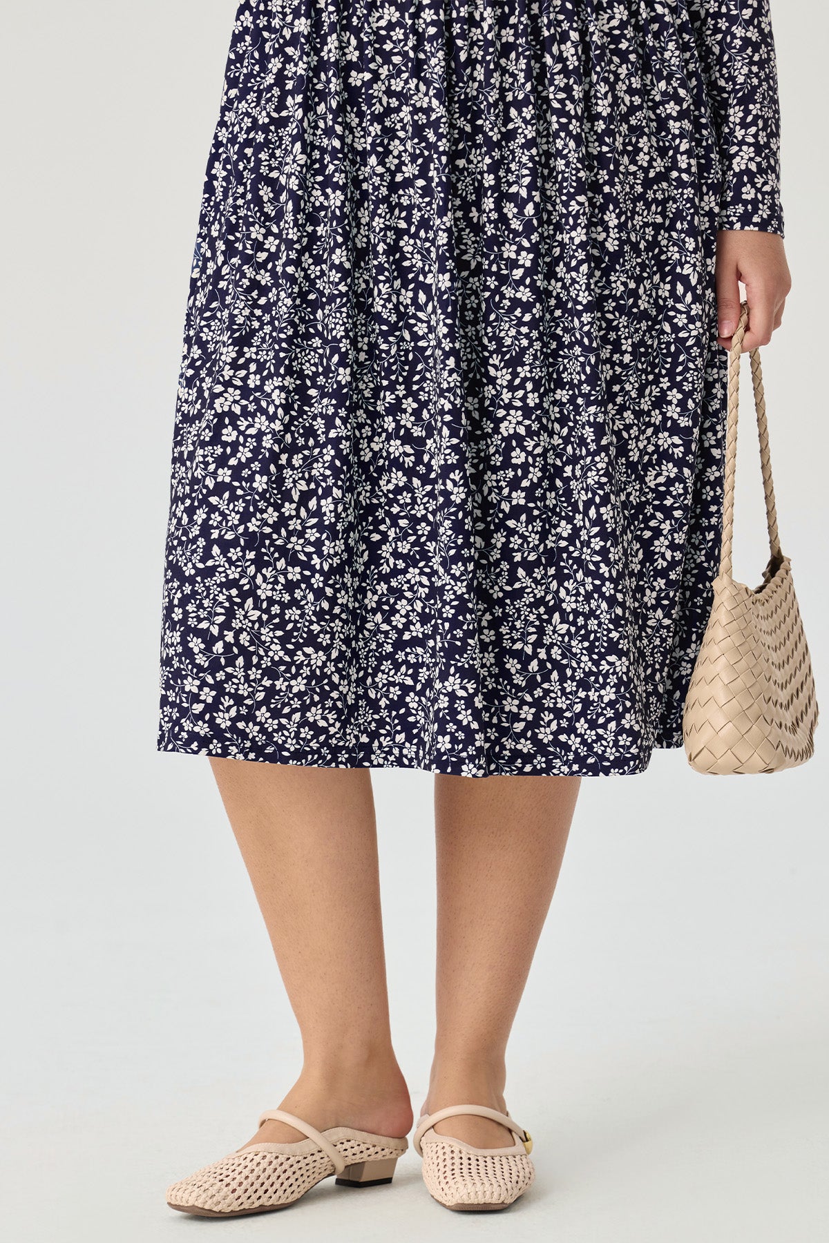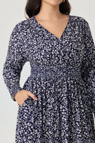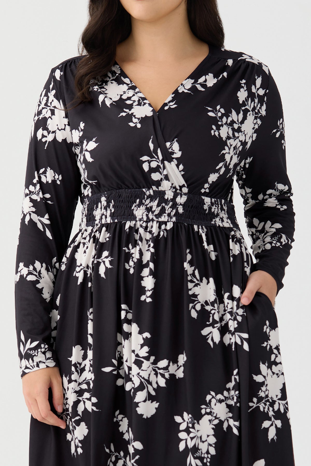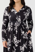 Floral Print Pockets Ruched Smocked Waist Midi Dress