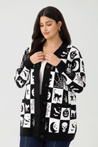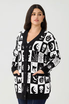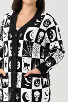 Step into the "Spooky Season" in style with our must-have Black & White Halloween Icons Cardigan. This isn't just a sweater—it's a statement piece that perfectly captures the gothic charm and playful spirit of fall. The classic black and white checkerboard pattern is filled with a fun cast of Halloween characters, including grinning jack-o'-lanterns, spooky skulls, sly black cats, crescent moons, and intricate spiderwebs.
