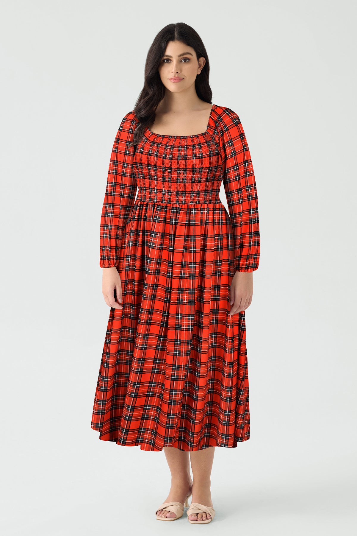Ritera Pocket Shirred Waist Plaid Floral Midi Dress