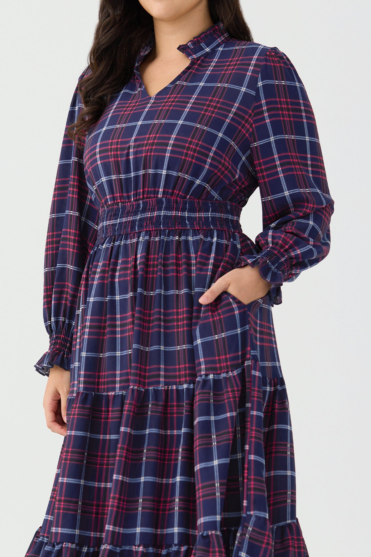 Plaid Notch Neck Tie Pocket Waist Tiered Maxi Dress