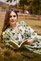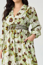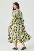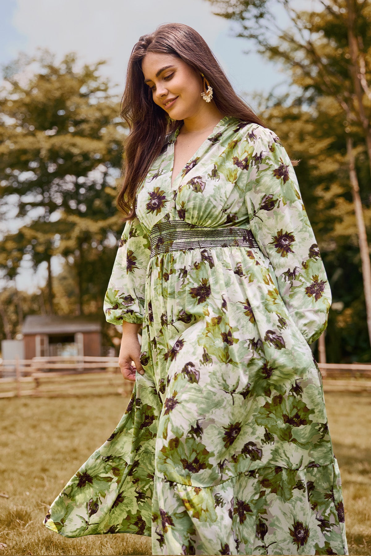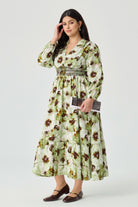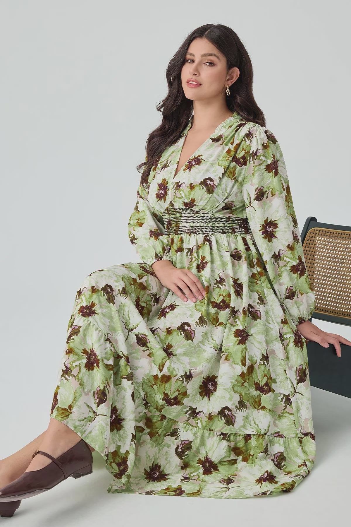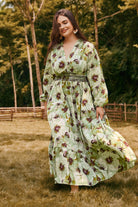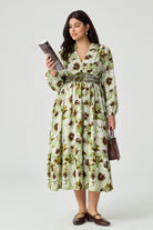Embrace effortless charm with our Green Floral Smocked Plus Size Midi Dress.The chic V-neckline and tiered midi skirt create a graceful silhouette, while the elegant long sleeves add a touch of sophistication. With its blend of bohemian style and modern comfort, this cottagecore-inspired dress includes convenient side pockets, making it both beautiful and practical. It's the perfect choice for anyone who loves a mix of romantic and relaxed style.