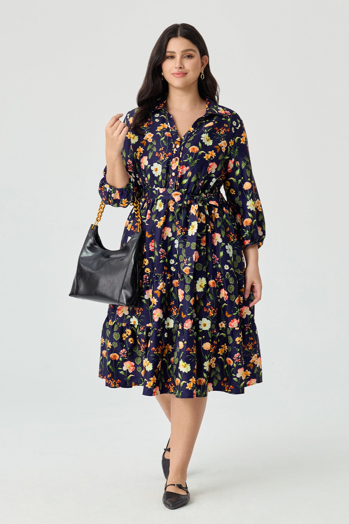 Ritera Pockets Floral Print Tiered A-Line Midi Shirt Dress with Belt