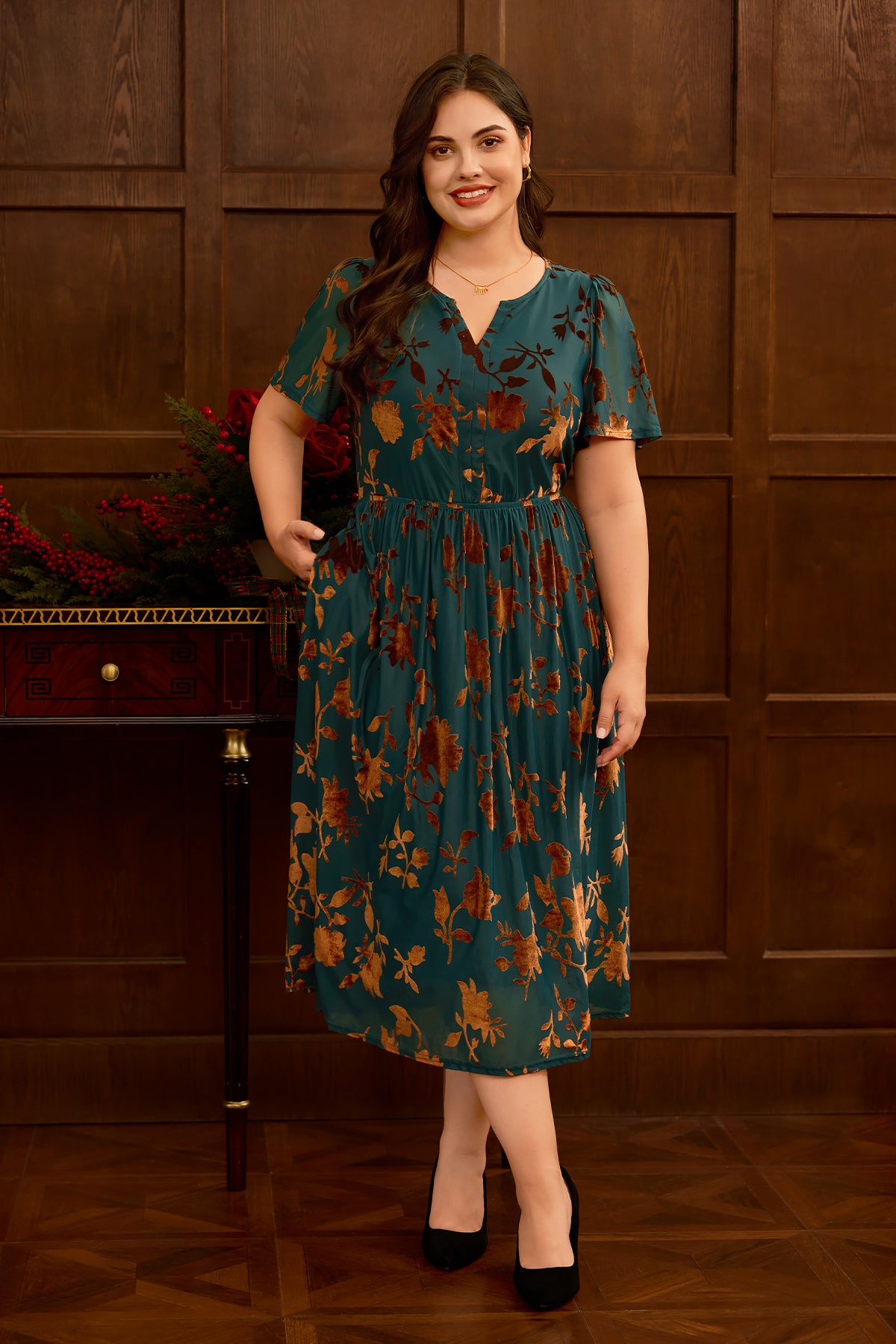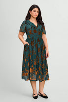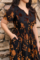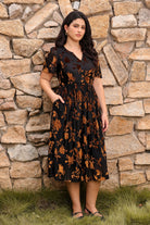 Elevate your casual wardrobe with this flattering plus-size midi dress featuring a stunning floral print in warm earth-toned browns (rust, olive, terracotta) on a rich black background—perfect for summer and beyond. Designed with functional side pockets (ideal for phones, cards, or keys), this dress blends style and practicality effortlessly.