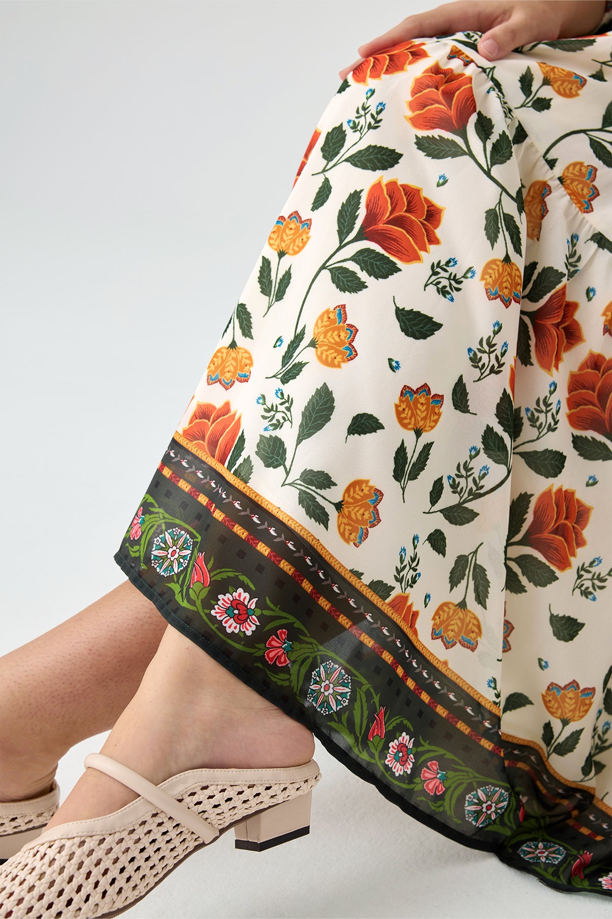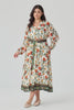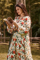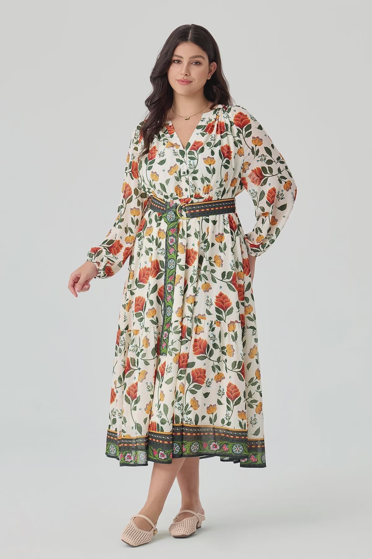 Step into a world of bohemian charm with our Floral Print Plus Size Midi Dress.Crafted from a soft, lightweight fabric, this beautiful dress features an elegant V-neckline and a flowy, tiered skirt that creates a graceful silhouette. The vibrant floral pattern in shades of orange and green gives it a timeless, romantic feel.The adjustable tie-waist ensures a comfortable, figure-flattering fit. With its effortless style and thoughtful design, this dress will make you feel confident and beautiful.