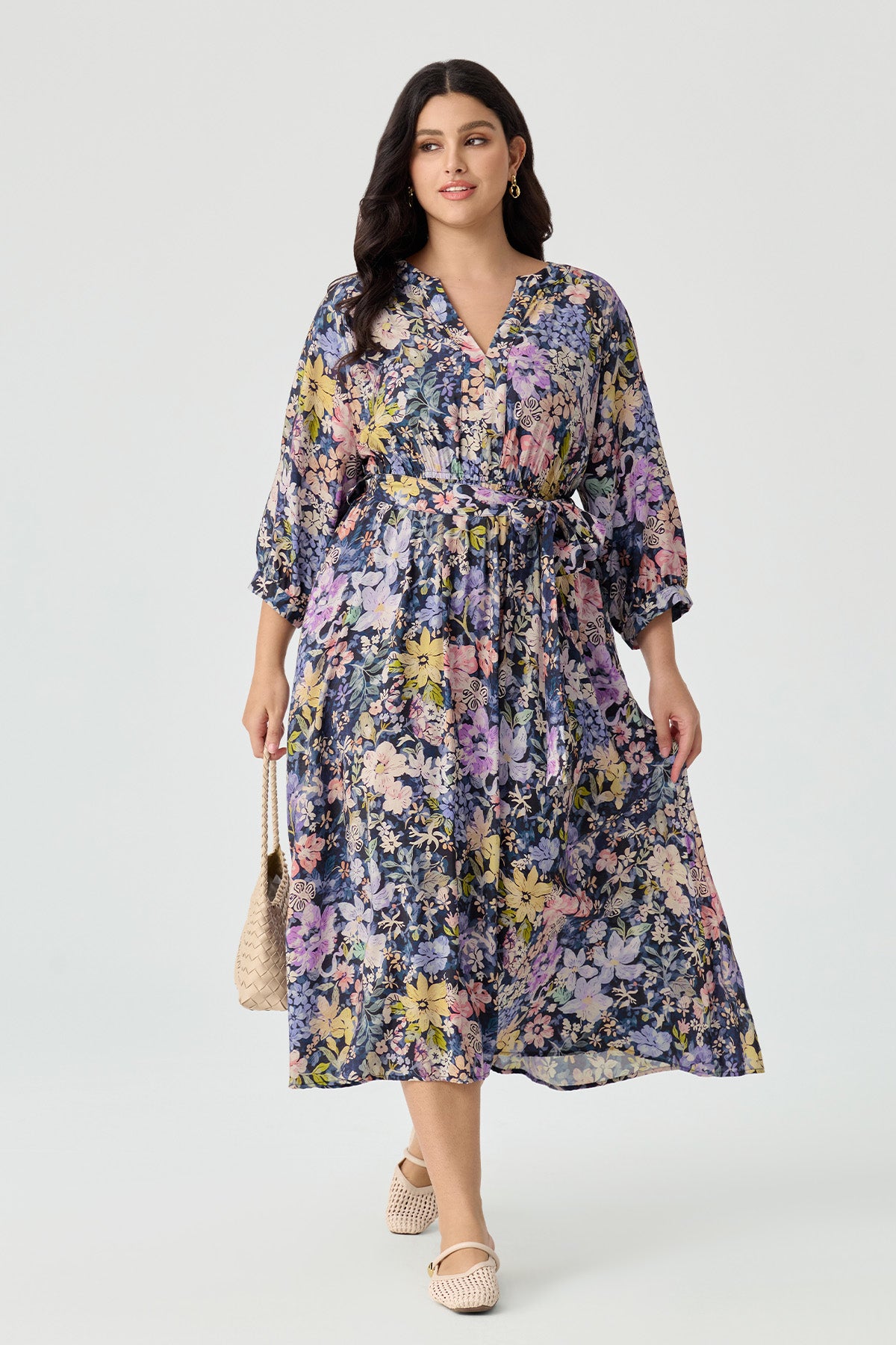 Discover the perfect blend of elegance and comfort with our Navy Floral Print Plus Size Midi Dress. The defining detail is the stylish self-tie waist belt, allowing you to cinch the dress for a customized, figure-flattering fit. We've also included discreet side pockets—a detail you'll love for its convenience. The effortless design and thoughtful features make this a dress you'll reach for again and again.