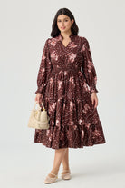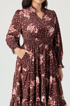 Step into romantic elegance with our Floral & Dotted Tiered Midi Dress. This enchanting dress features a beautiful all-over floral and polka-dot print and a graceful tiered skirt that creates a stunning, flowy silhouette. The smocked bodice and ruffled collar provide a comfortable and flattering fit that accentuates your curves, while the long, balloon-style sleeves with elastic cuffs add a touch of vintage-inspired charm.