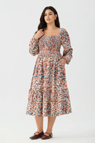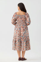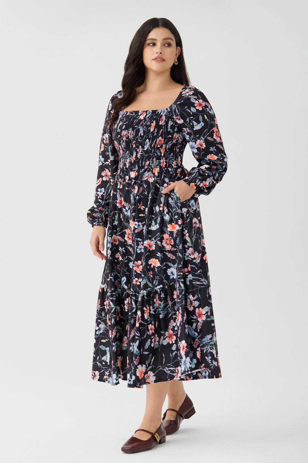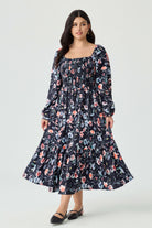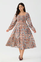 Embrace a romantic and effortless look with our Floral Tiered Midi Dress. This charming dress features a beautiful all-over floral print and a graceful tiered skirt that creates a stunning, flowy silhouette. The smocked bodice and square neckline offer a comfortable and flattering fit that accentuates your curves, while the long, puff sleeves with elastic cuffs add a touch of vintage-inspired charm.