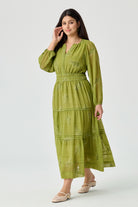 Ritera Sequin Embroidery Leaves Smocked Waist Tiered Midi Dress