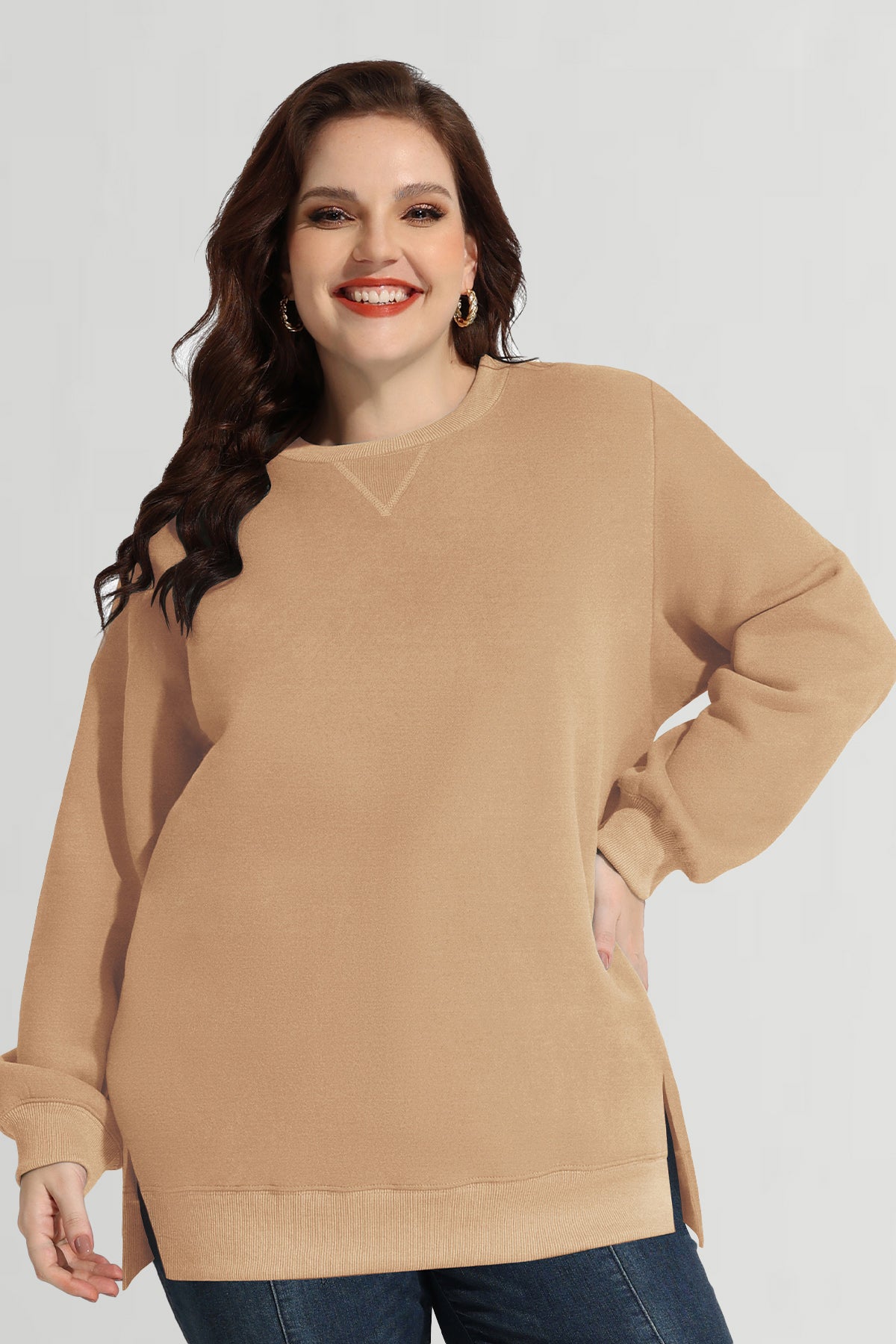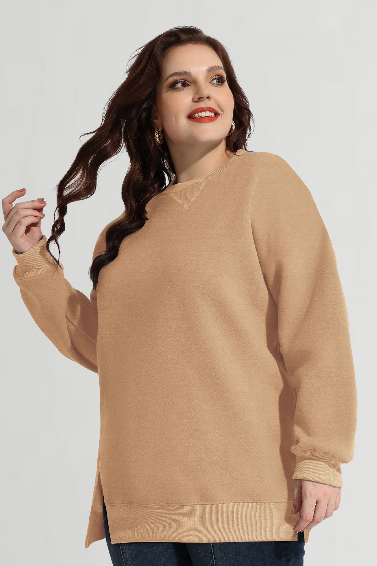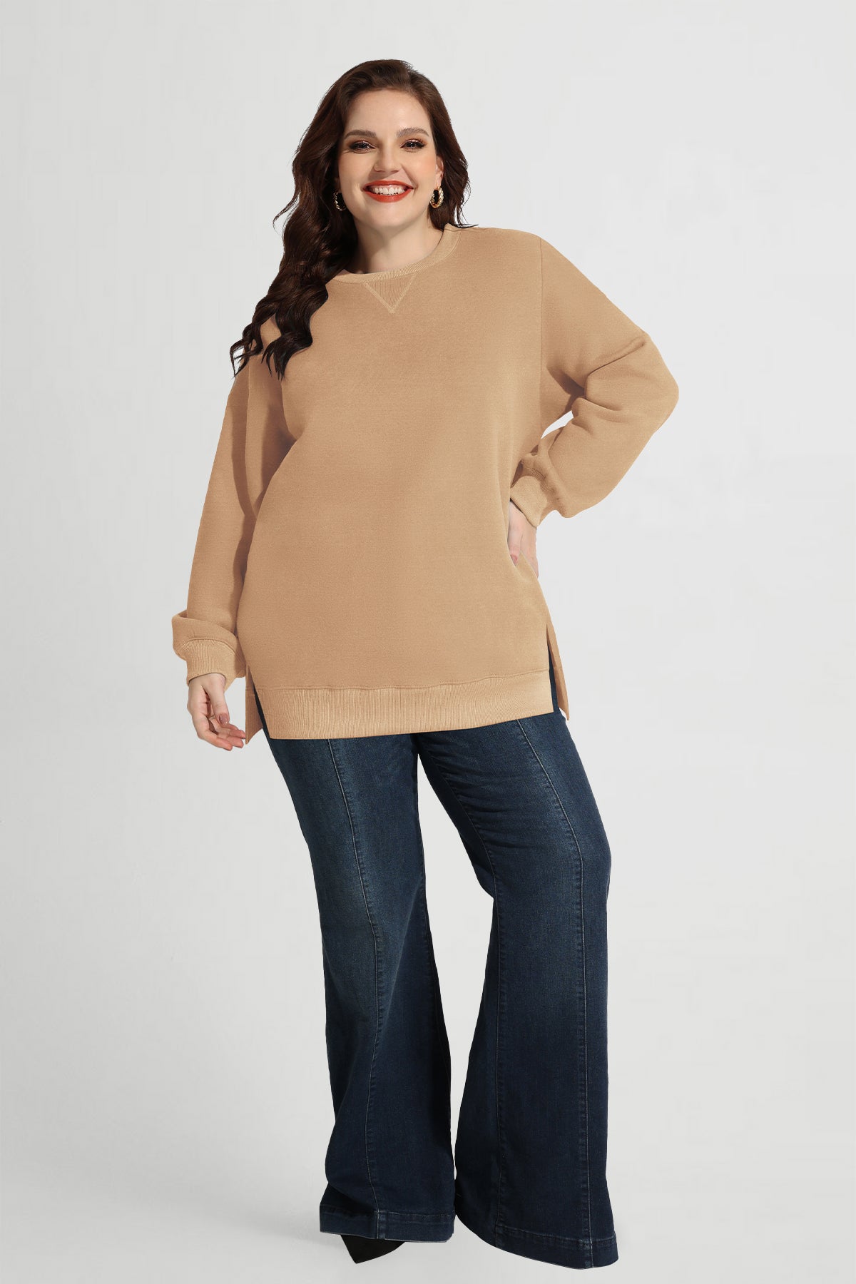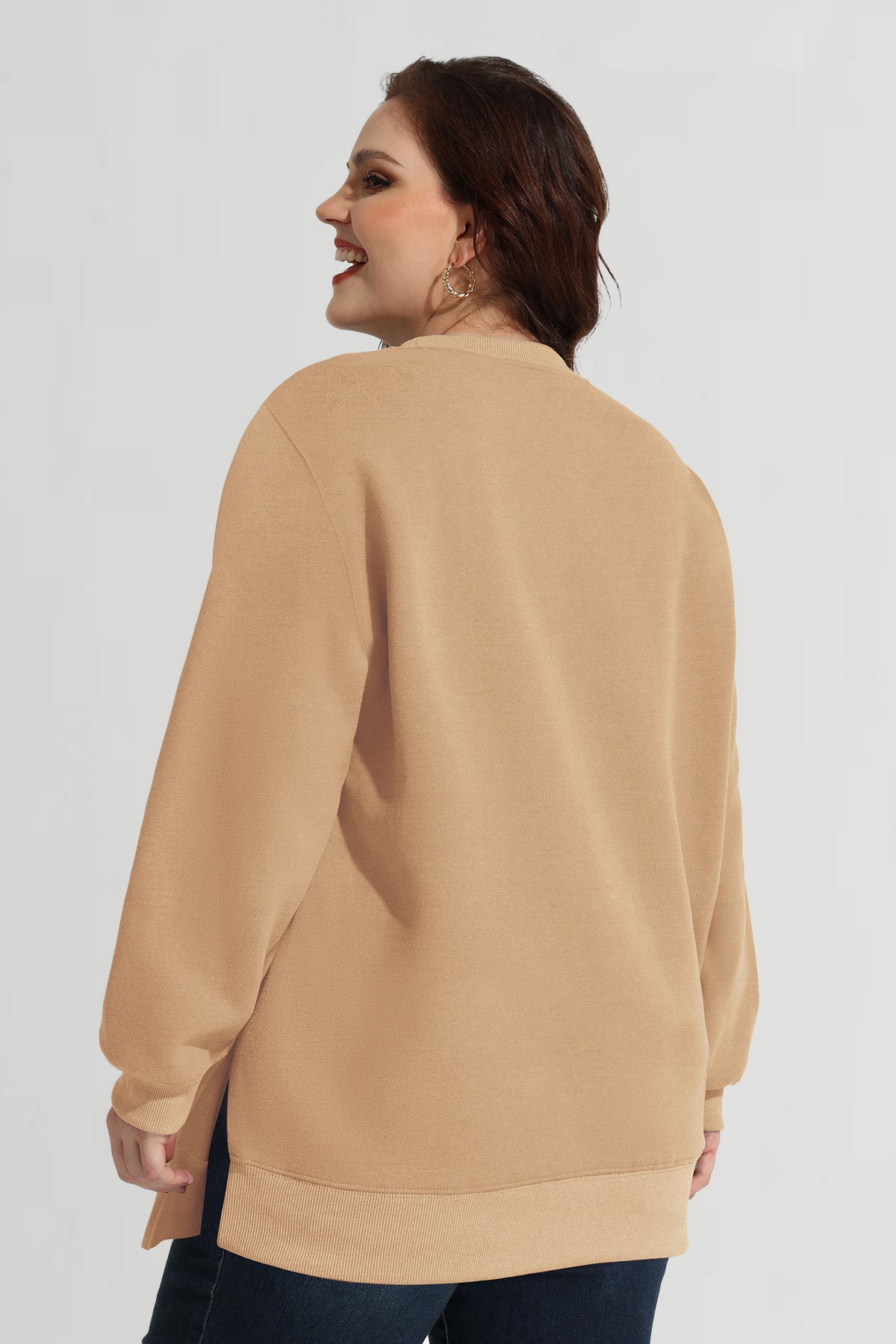 Sweat-shirt basique à manches longues et ourlet fendu uni