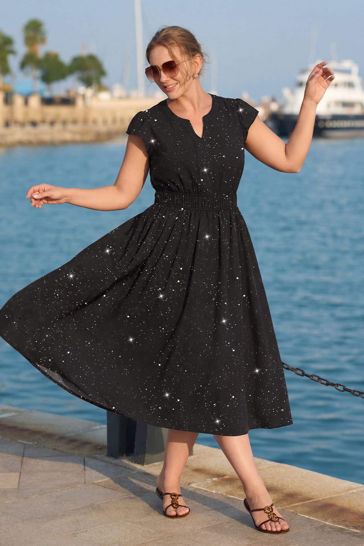 Pockets Smocked Waist Stars Print A-line V-neck Maxi Dress