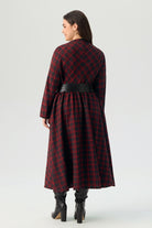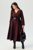 Plaid V Neck Button Front Long Sleeve Belted Maxi Dress