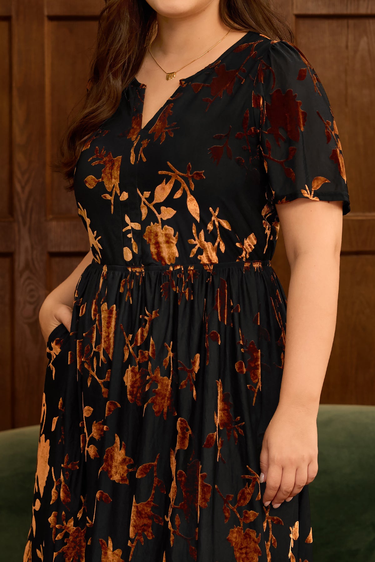 Elevate your casual wardrobe with this flattering plus-size midi dress featuring a stunning floral print in warm earth-toned browns (rust, olive, terracotta) on a rich black background—perfect for summer and beyond. Designed with functional side pockets (ideal for phones, cards, or keys), this dress blends style and practicality effortlessly.