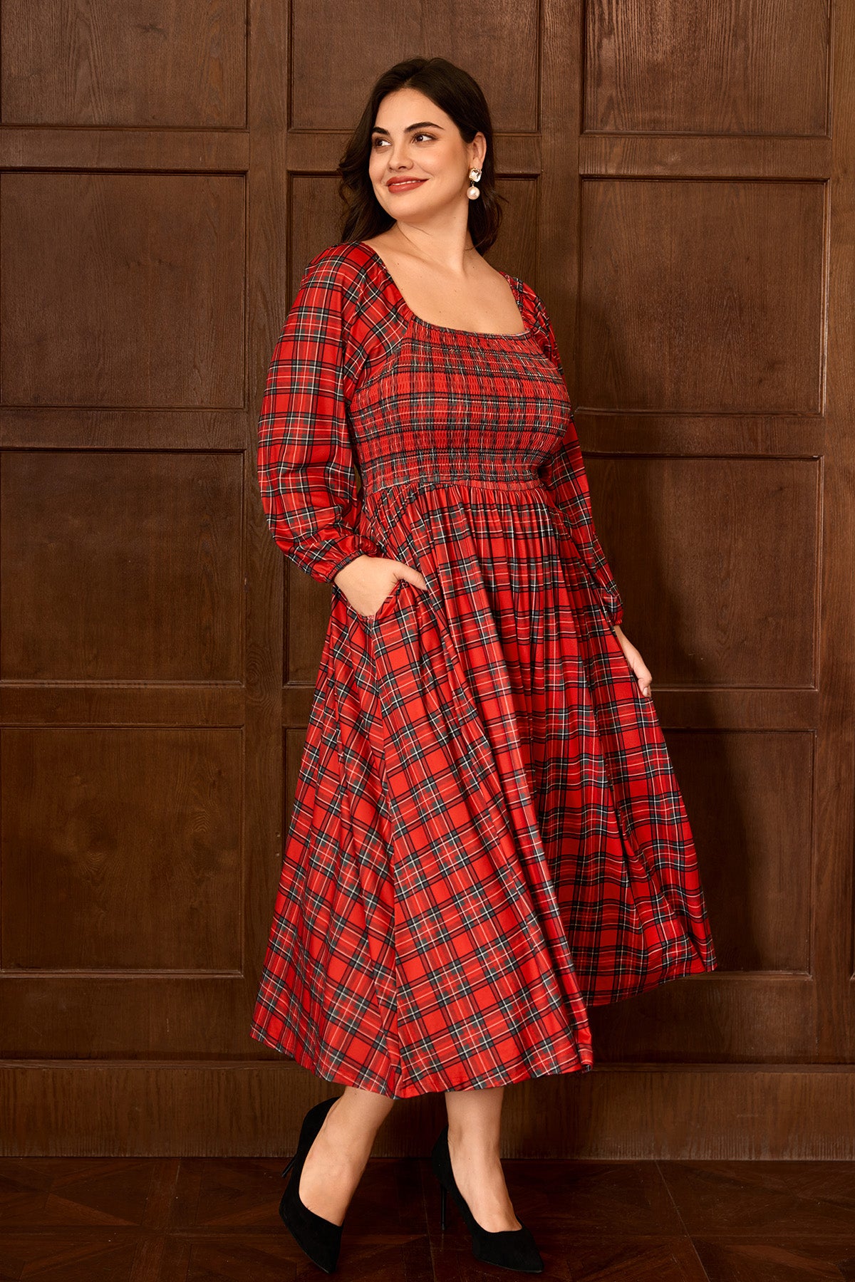 Step into the season with style and comfort in our enchanting "Harvest Plaid" Smocked Midi Dress. This vibrant red tartan dress is a true showstopper, blending classic appeal with modern design elements to create a flattering and versatile piece for your wardrobe. Perfect for crisp fall days, holiday gatherings, or simply adding a touch of cozy elegance to your everyday look.