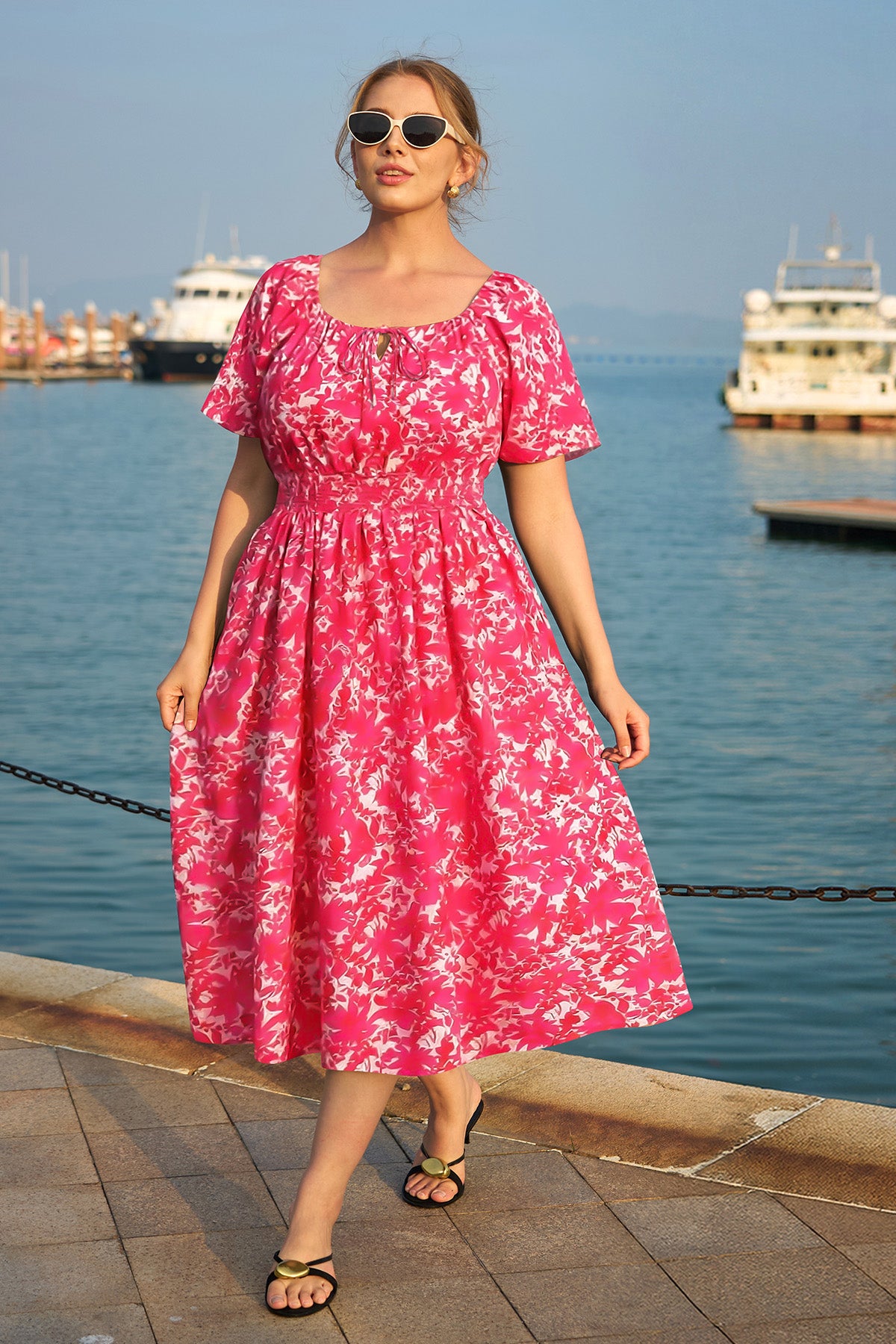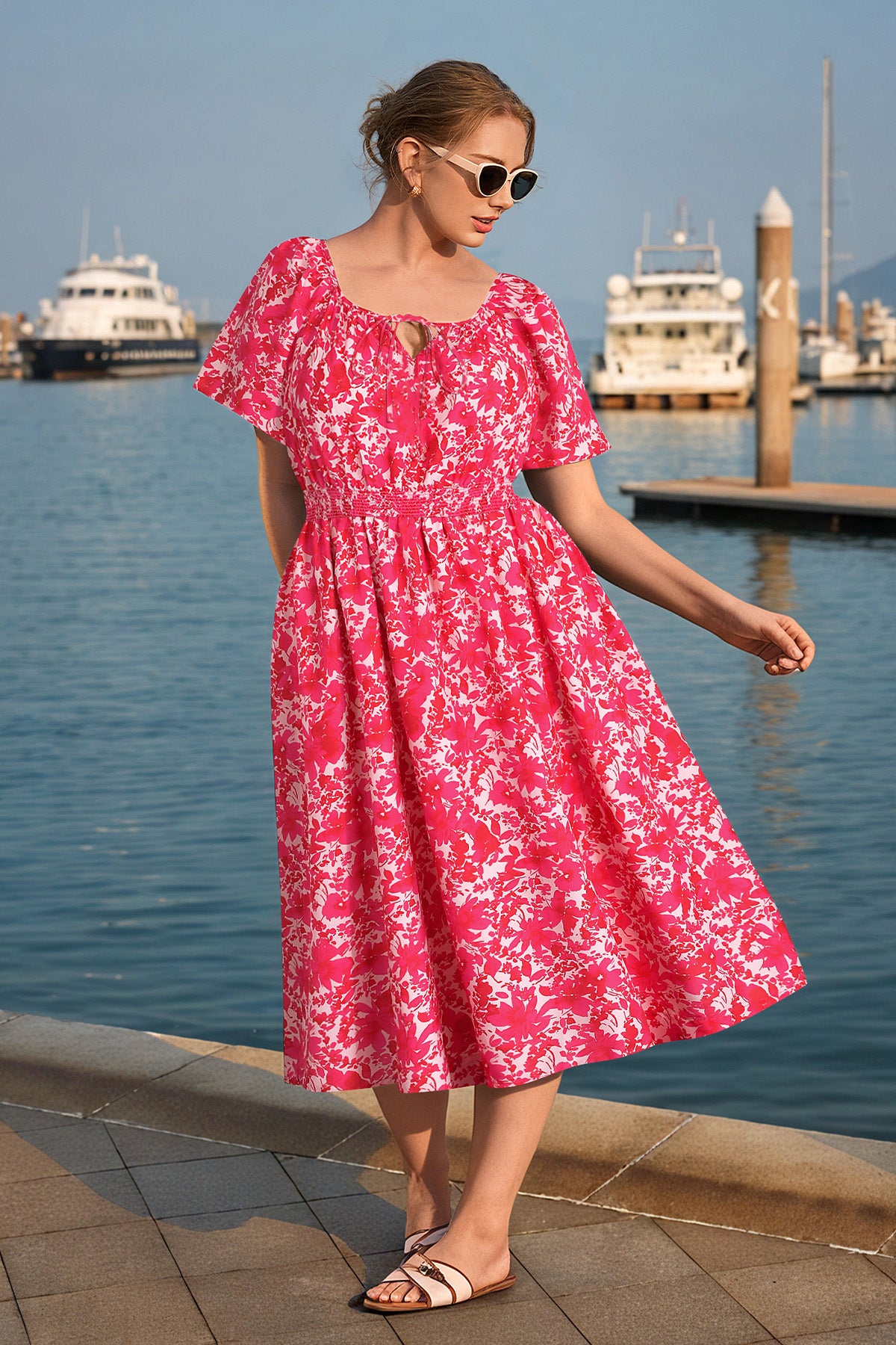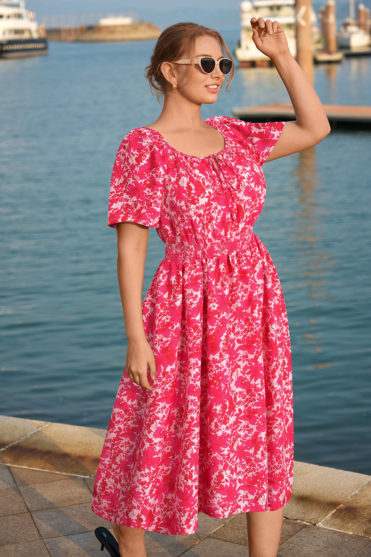 This vibrant midi dress features a lively pink tonal floral print that exudes romantic charm. Its delicate tie-front square neckline adds a soft, feminine touch, while the elasticated waist cinches gently to flatter your silhouette—paired with puff short sleeves and a flowy A-line skirt, it balances playful style and effortless all-day comfort.