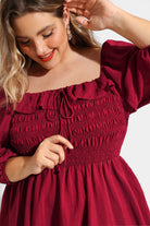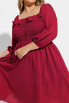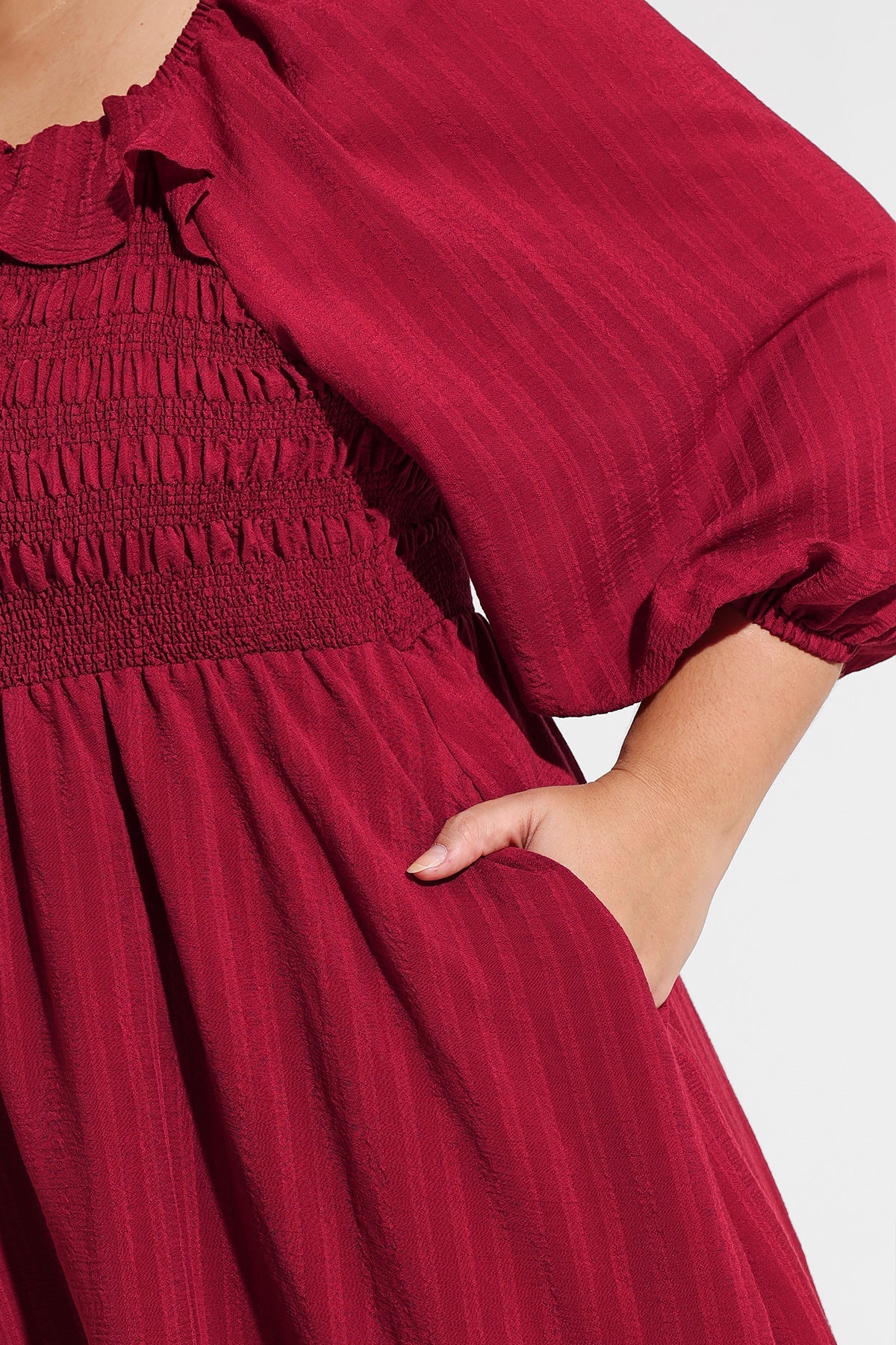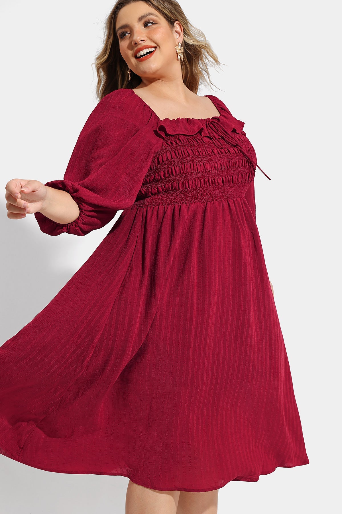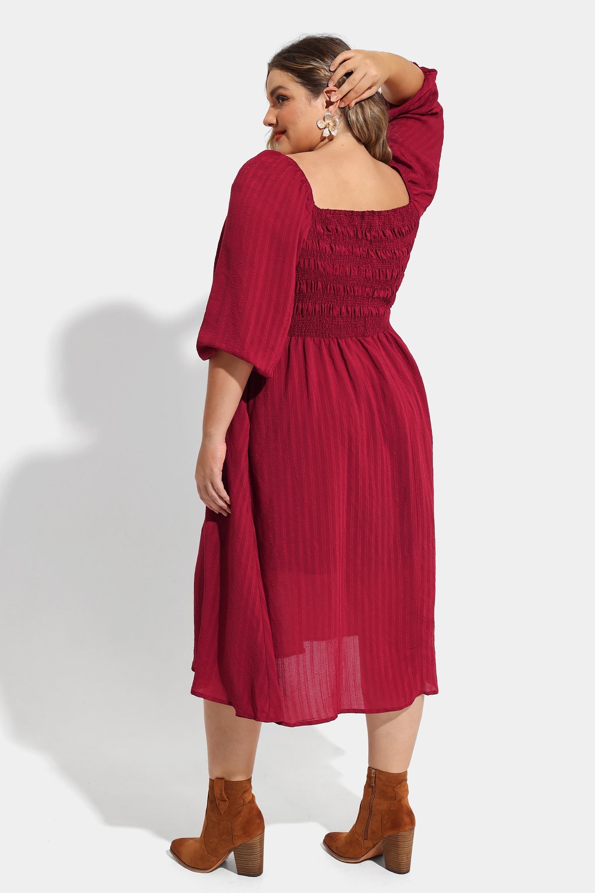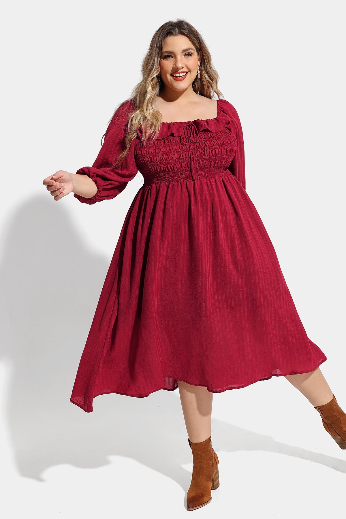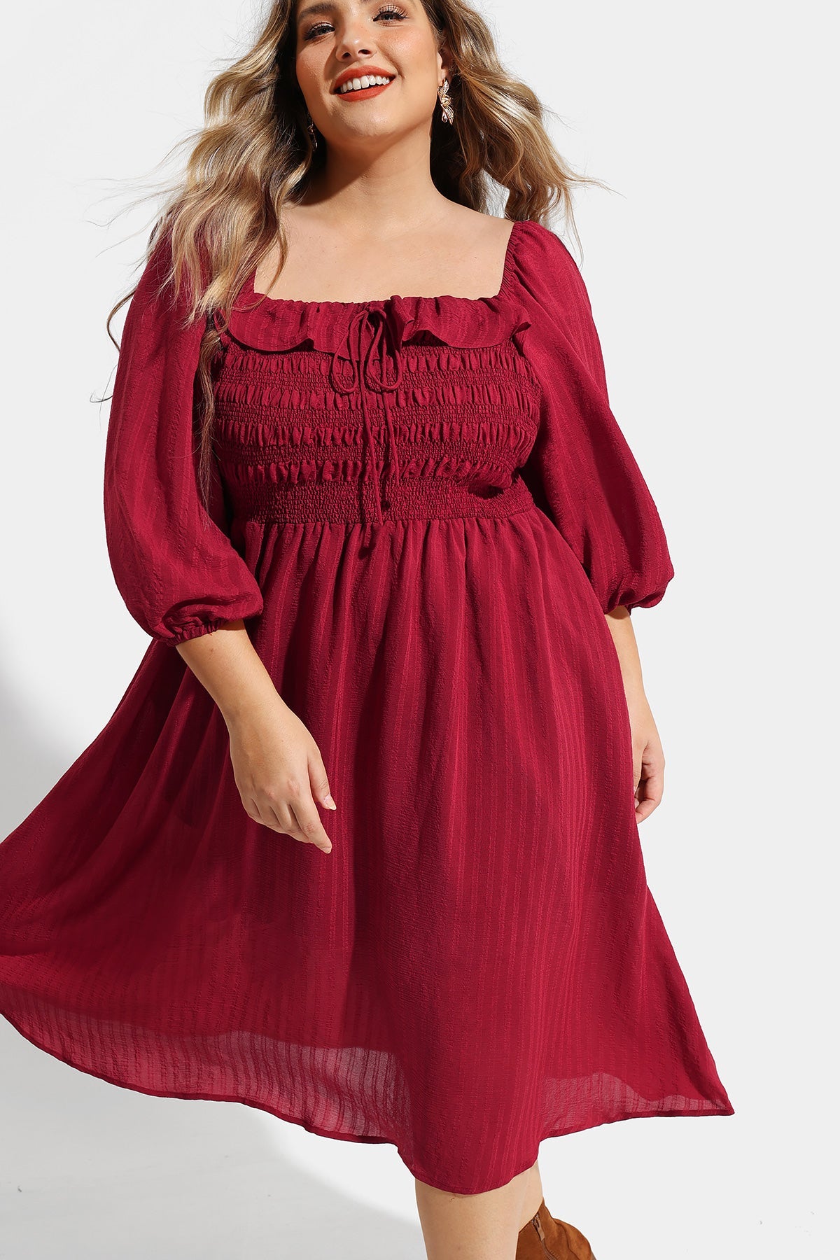 Robe mi-longue froncée à manches quart de lanterne et cordon de serrage