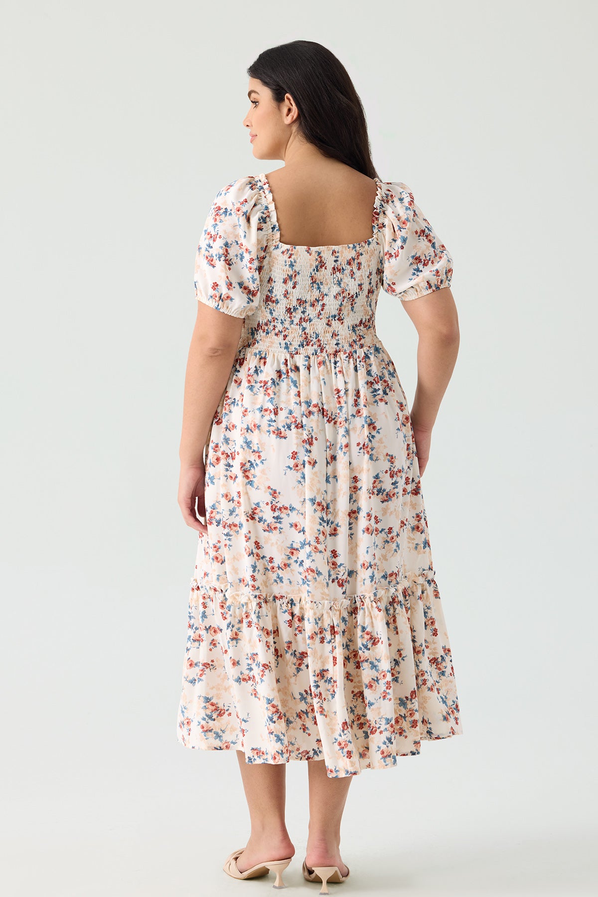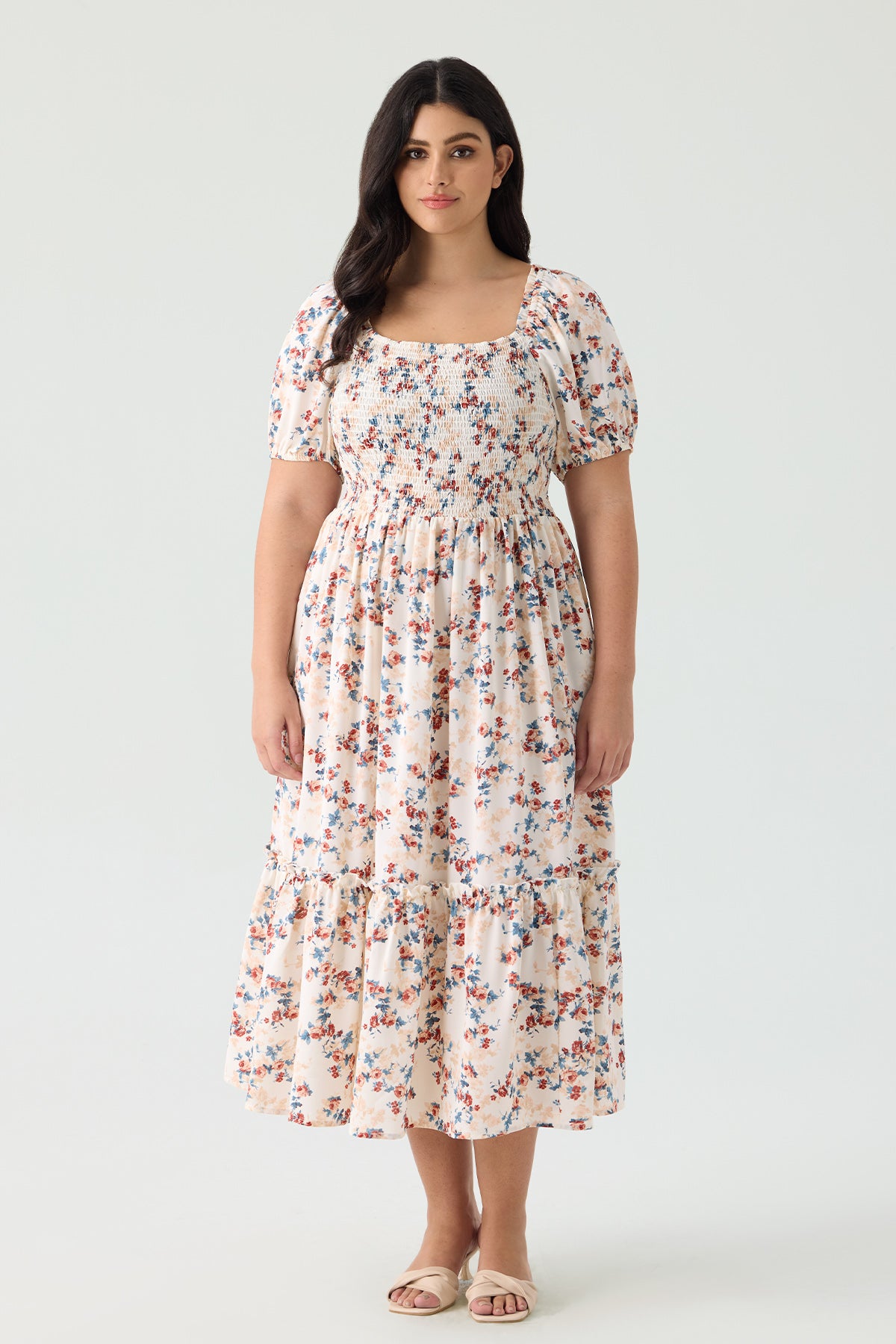 Float through sunny days in effortless style with our beautiful plus-size floral midi dress. Designed to flatter and delight, this dress features a delicate pastel floral print on a crisp white background, making it the perfect choice for warm weather events and everyday charm.